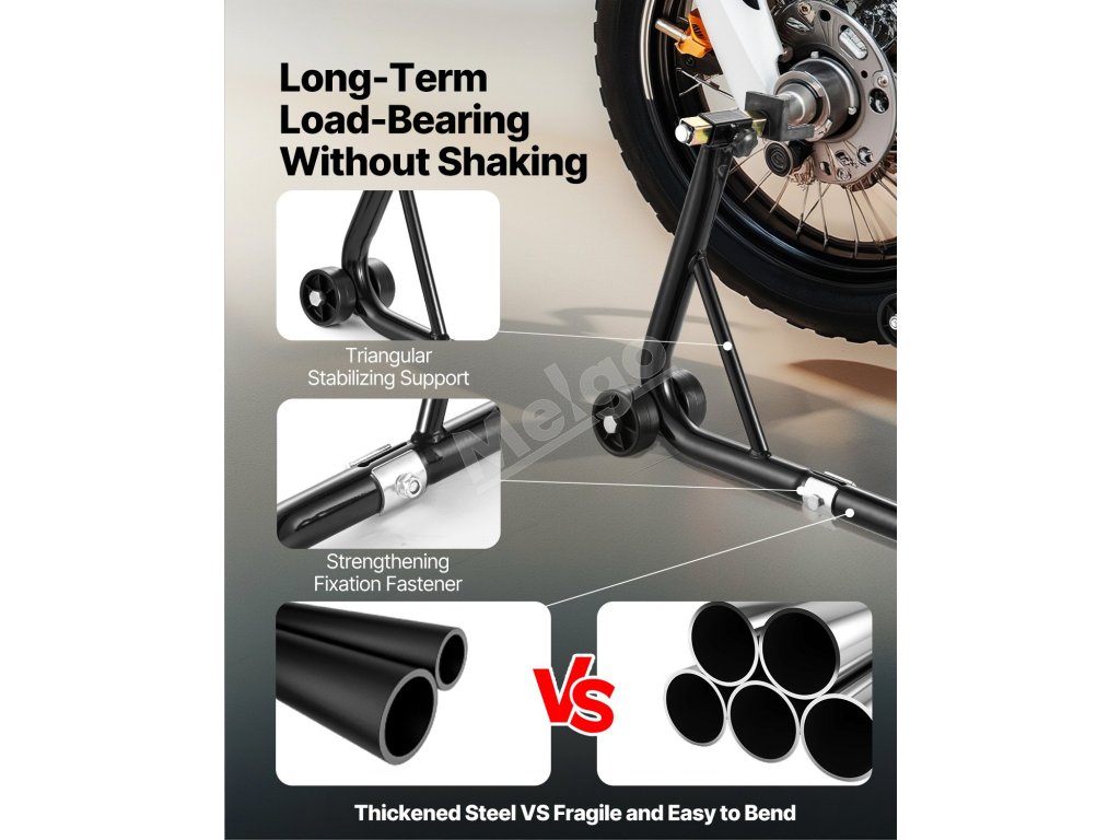 Náš stojan na údržbu motocyklov je vyrobený z profesionálnej zosilnenej ocele pre veľké zaťaženie a poskytuje stabilnú oporu pre väčšinu motocyklov. Je odolný voči deformácii a ohýbaniu, je ideálny na domáce opravy, dlhodobé skladovanie a bežnú údržbu.