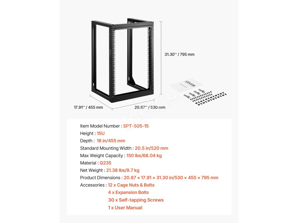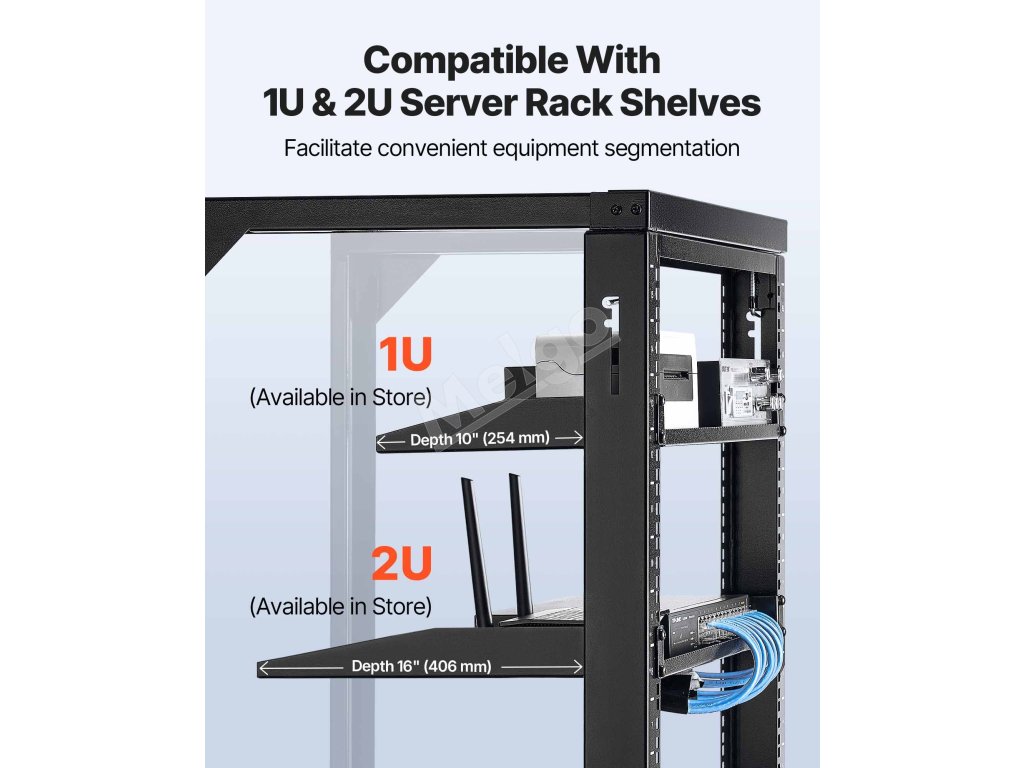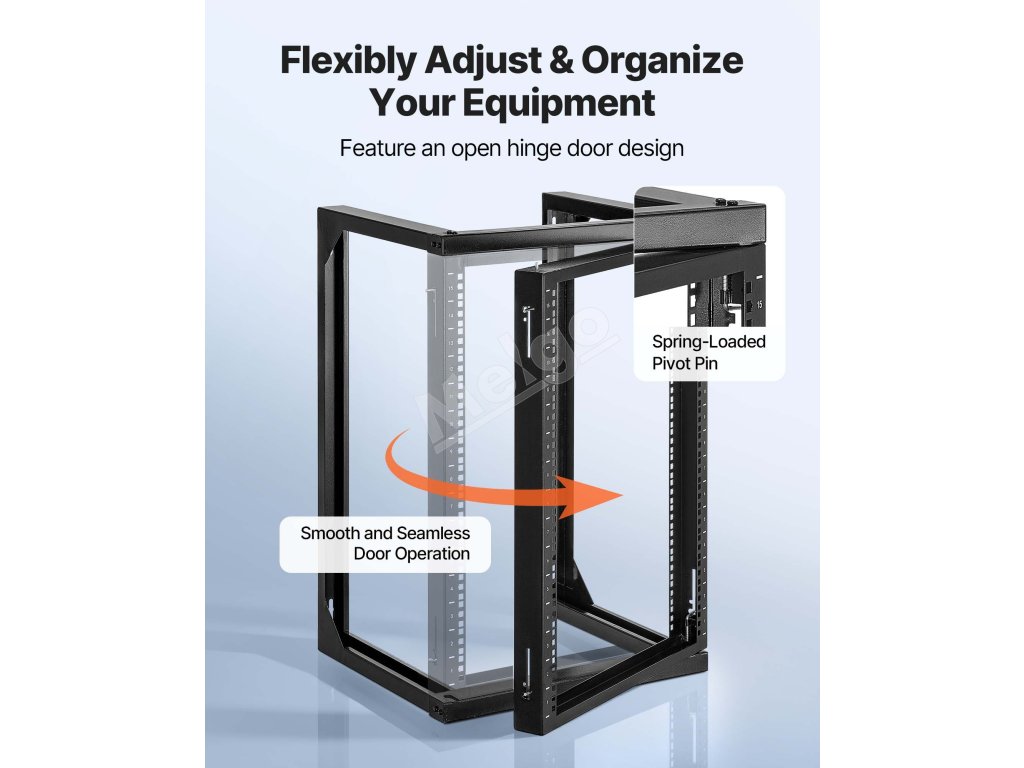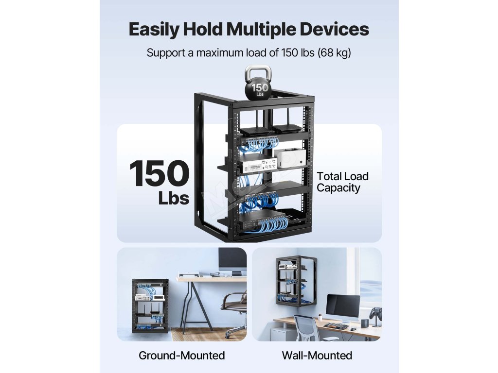 Náš sieťový stojan je vybavený otvorenými výklopnými dverami, ktoré podporujú otváranie do 180°. Vďaka pevnej konštrukcii z uhlíkovej ocele unesie až 150 libier (68 kg) a udrží vaše zariadenia stabilné. Vďaka kompletnému príslušenstvu môžete bezpečne namontovať prepínače alebo iné sieťové zariadenia priamo na stojan!