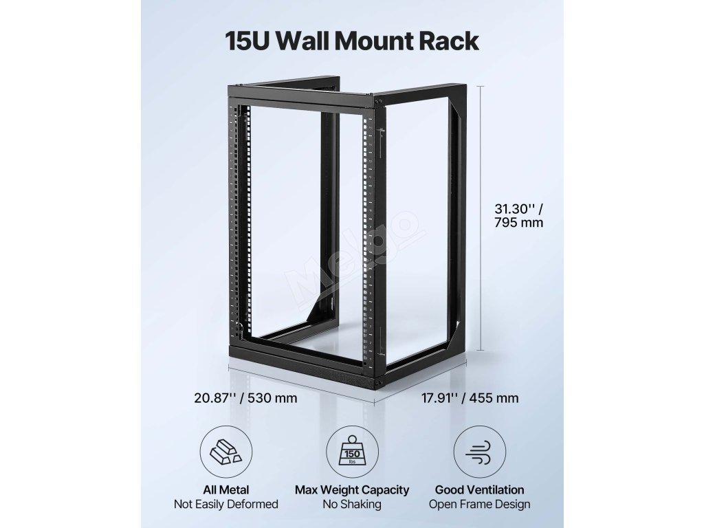 Stenový serverový rack 15U, otvorený rám, 68.04 kg, 180° otváranie