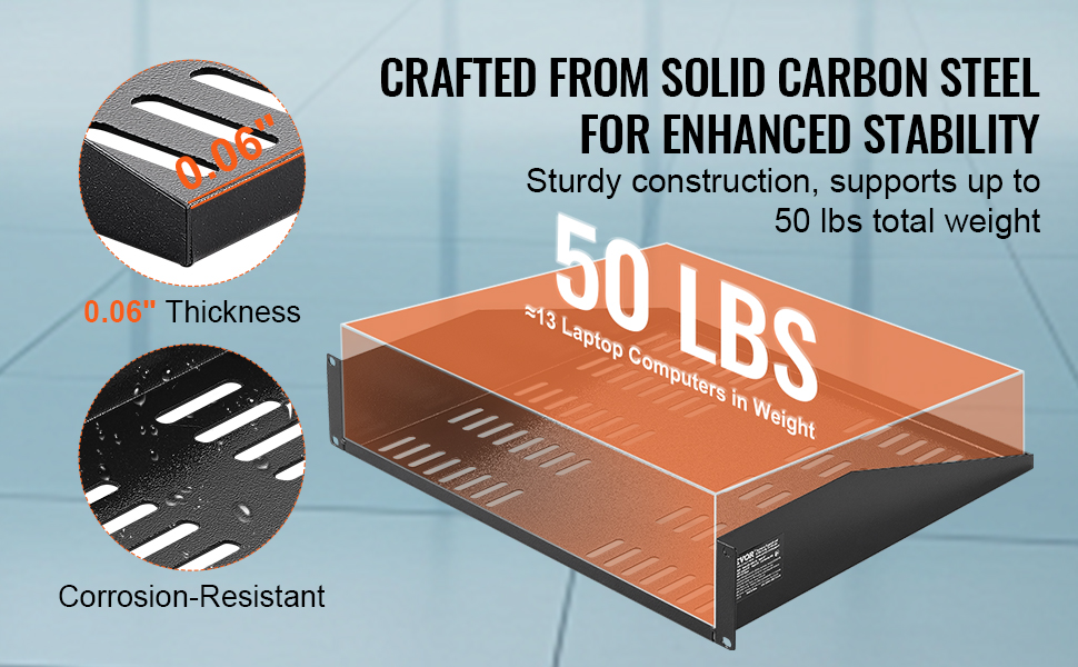 Táto serverová polica do racku je vyrobená z uhlíkovej ocele odolnej proti korózii a opotrebovaniu a ponúka robustnú a stabilnú podporu. Bezpečne udrží rôzne zariadenia a počas používania zostáva stabilná a bezpečná bez kolísania alebo nakláňania.