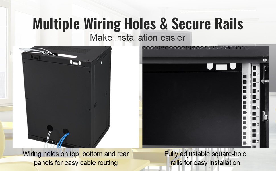 Naša sieťová skriňa je vybavená viacerými otvormi na vedenie káblov, čo uľahčuje ich prehľadné vedenie a organizáciu. Tento premyslený dizajn udržiava vašu zostavu v ostrom vzhľade a zabezpečuje neporiadok v interiéri, čím zvyšuje funkčnosť aj estetiku.