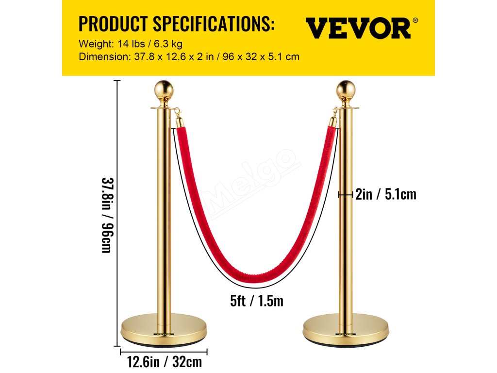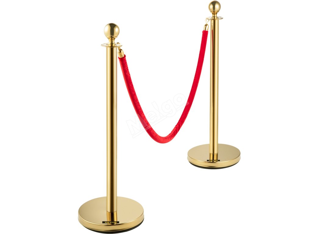 Set 2 zlatých nerez stĺpov, okrúhly vrch, 4× červené 1,5 m laná