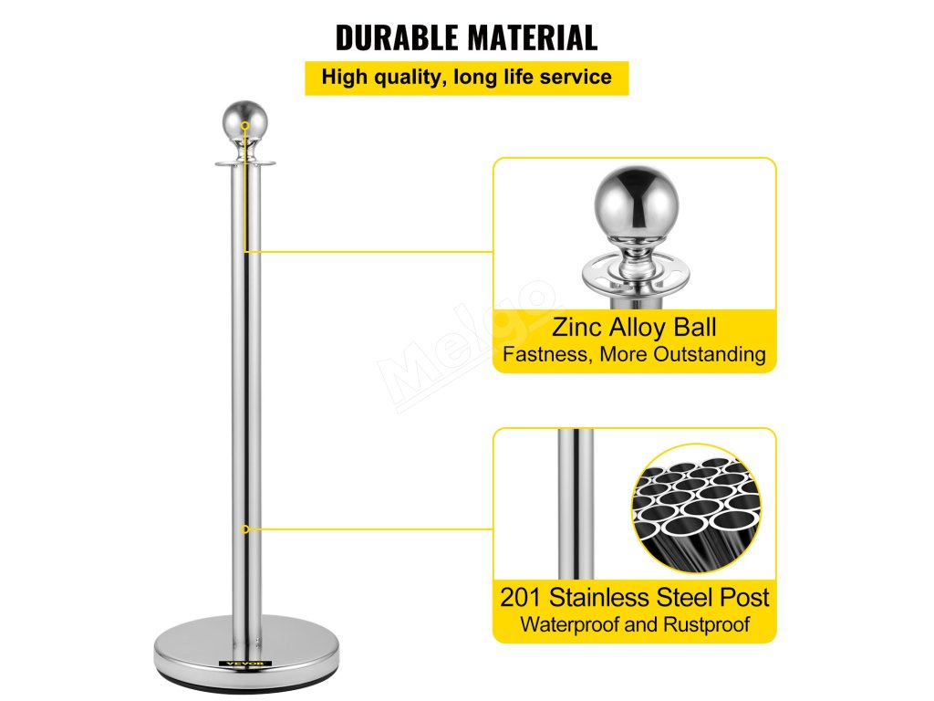 Stĺpiky na kontrolu davu sú vyrobené z nehrdzavejúcej ocele 201 a zliatiny zinku, ktorá je vodotesná a odolná proti korózii, nebojí sa vysokej teploty. Tento odolný materiál zaručuje, že stĺpik má dlhú životnosť.