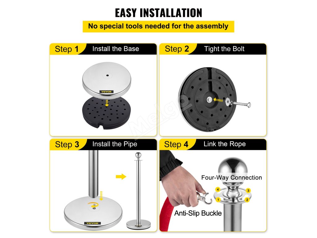 Každý stĺpik stojana má v hornej časti štyri otvory, zatiaľ čo každé lano má na každom konci pracky, aby ste mohli vykonať rýchle spojenie v správnom smere. Jednoduchá montáž, nie sú potrebné žiadne špeciálne nástroje.