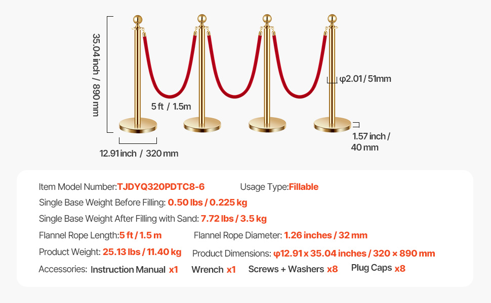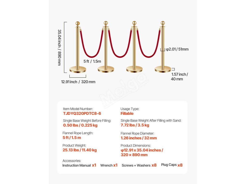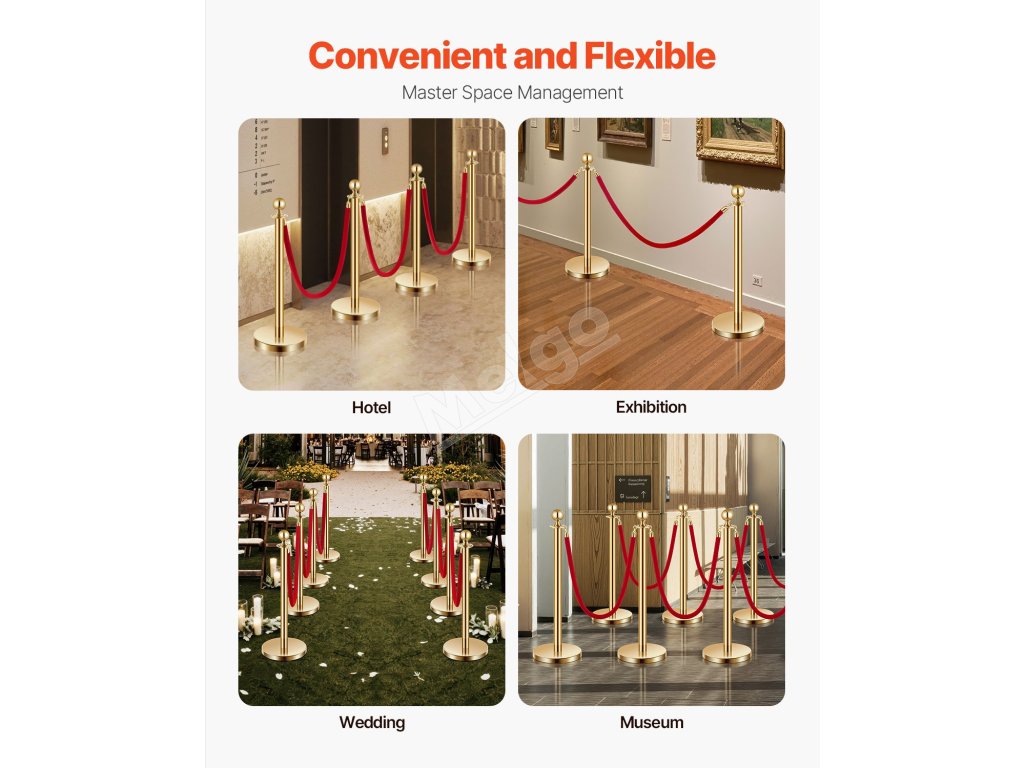 Každý stĺpik sa dodáva so zamatovým lanom s dĺžkou 4,92 ft / 1,5 m, vďaka čomu si môžete jednoducho nastaviť dĺžku podľa svojich potrieb. Je to ideálne riešenie pre všetky vaše požiadavky na riadenie davu - rýchlo a jednoducho sa prispôsobí akémukoľvek podujatiu.