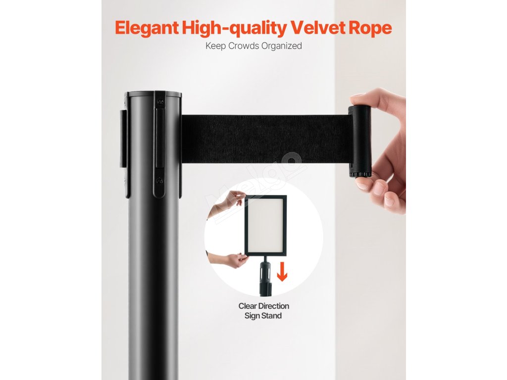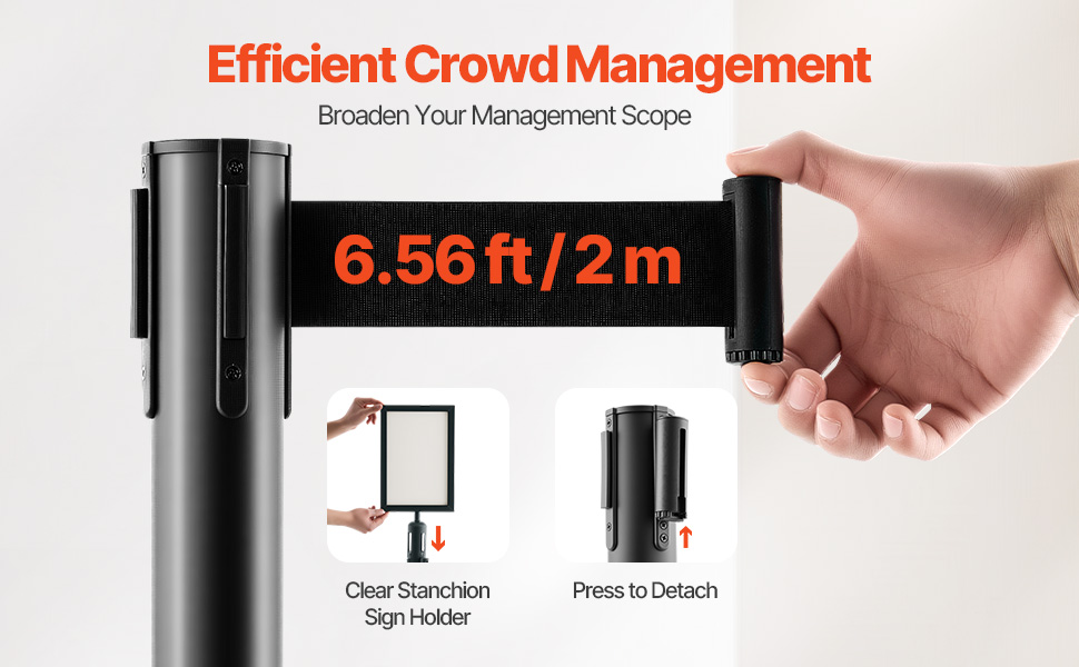 Každá zábrana na kontrolu davu sa dodáva so zaťahovacím pásom, vďaka čomu je vysoko univerzálna a ľahko sa nastavuje. Pás môžete jednoducho predĺžiť alebo skrátiť, aby sa prispôsobil rôznym priestorom a príležitostiam, čo vám ponúka flexibilné riešenia na riadenie davu.