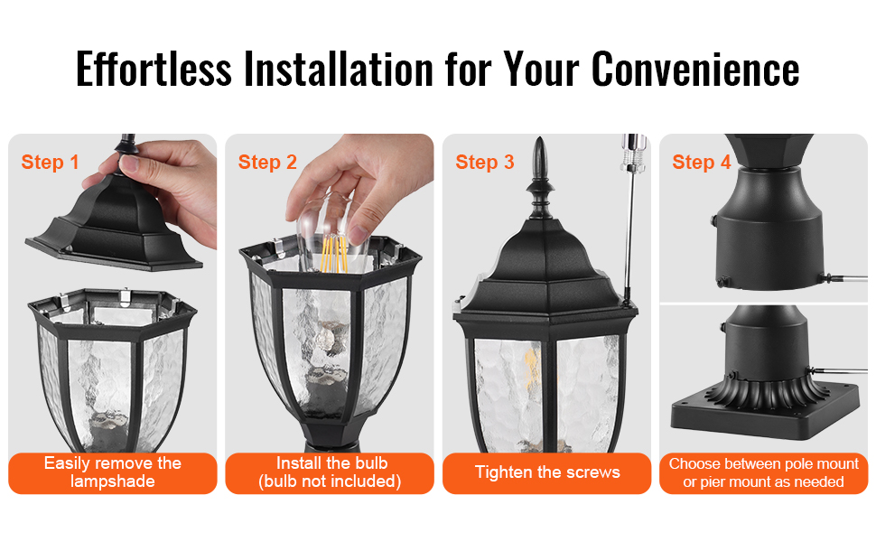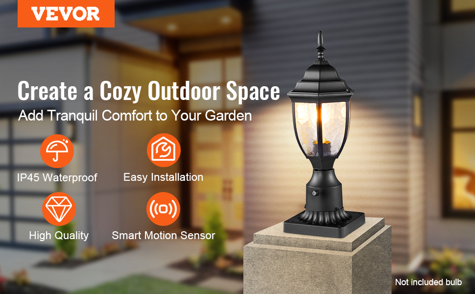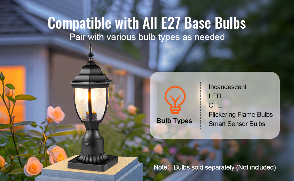 Naše vonkajšie stĺpikové svietidlo je kompatibilné so všetkými žiarovkami s päticou E27 vrátane žiaroviek, LED, CFL, žiaroviek s blikajúcim plameňom a žiaroviek s inteligentným senzorom (Žiarovky sa predávajú samostatne, nie sú súčasťou dodávky). Umožňuje vám prispôsobiť si osvetlenie podľa vašich potrieb a preferencií.