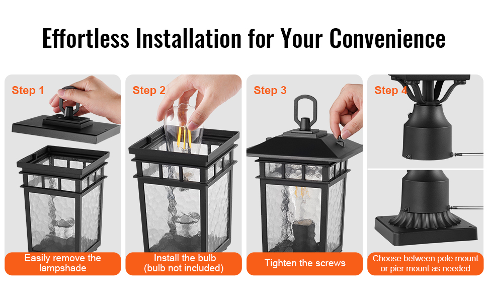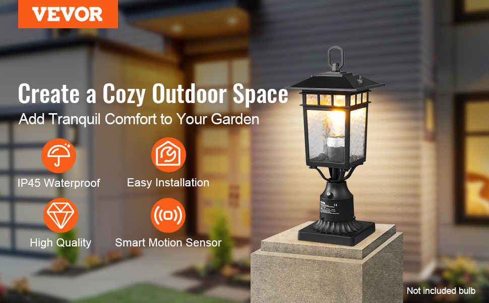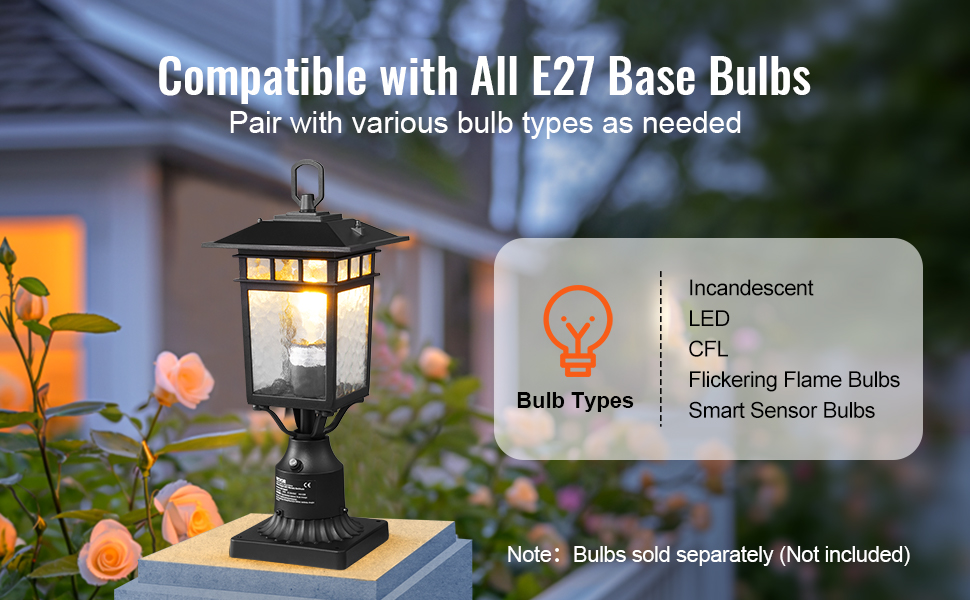 Naše vonkajšie stĺpikové svietidlo je kompatibilné so všetkými žiarovkami s päticou E27 vrátane žiaroviek, LED, CFL, žiaroviek s blikajúcim plameňom a žiaroviek s inteligentným senzorom (Žiarovky sa predávajú samostatne, nie sú súčasťou dodávky). Umožňuje vám prispôsobiť si osvetlenie podľa vašich potrieb a preferencií.