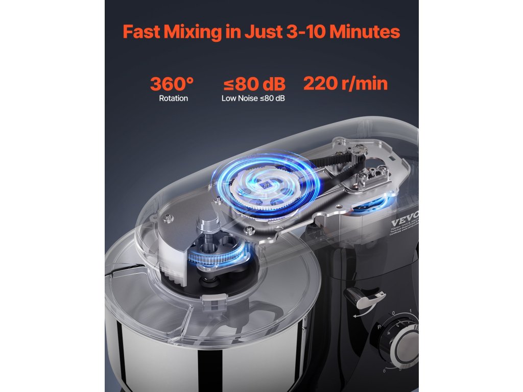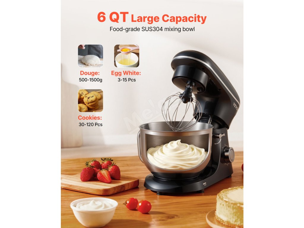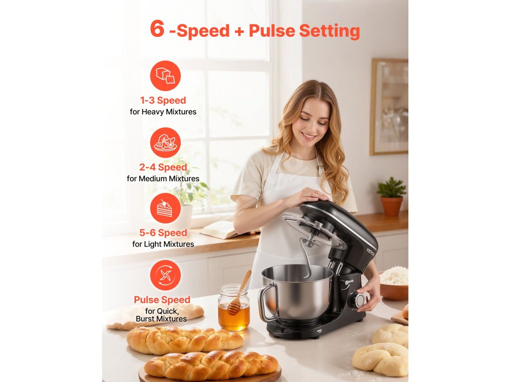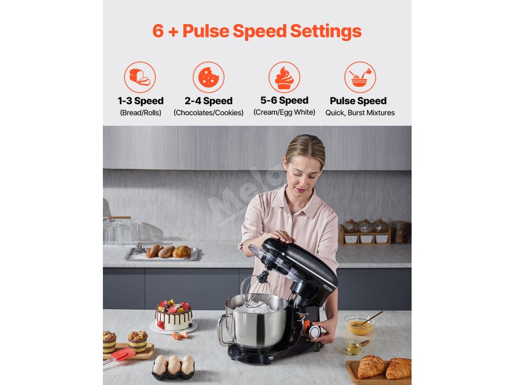 Zbavte sa starostí s prípravou jedla s naším stojanovým mixérom. Vďaka priestrannej miešacej mise s objemom 6 qt (5,68 l) zvládnete bez námahy veľké dávky. vďaka 6 rýchlostiam, pulznej funkcii a 3 nadstavcom je ideálny na všetky ingrediencie. Zostavený z robustného kovu a nehrdzavejúcej ocele pre dlhotrvajúcu odolnosť.