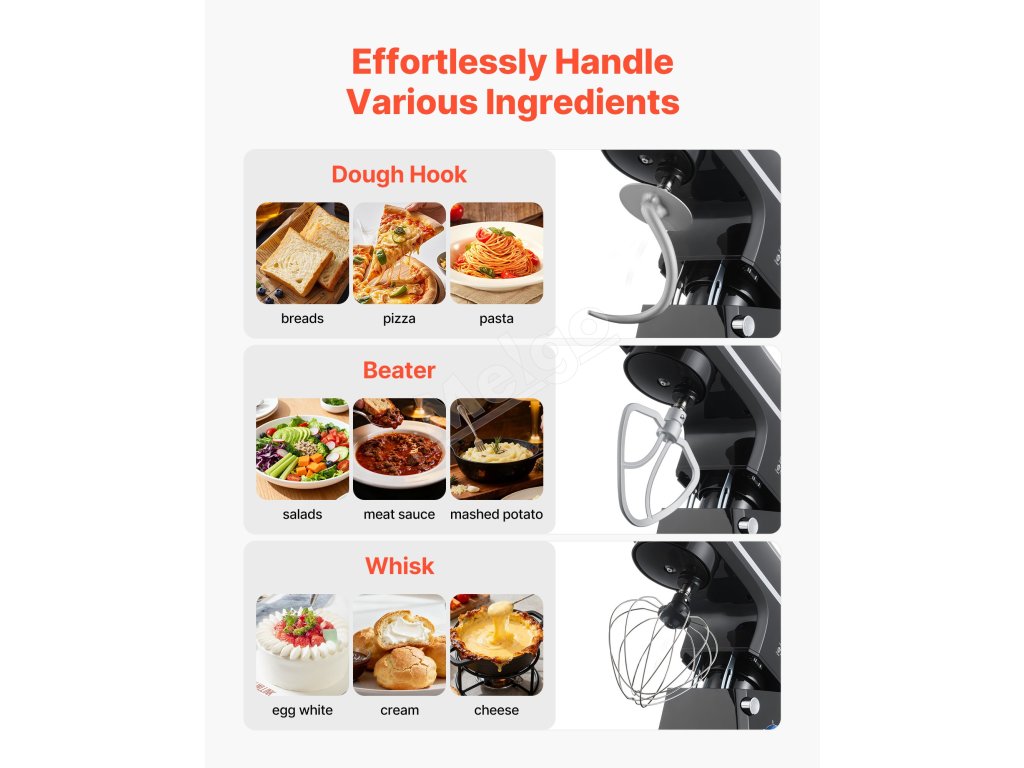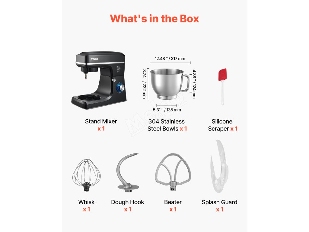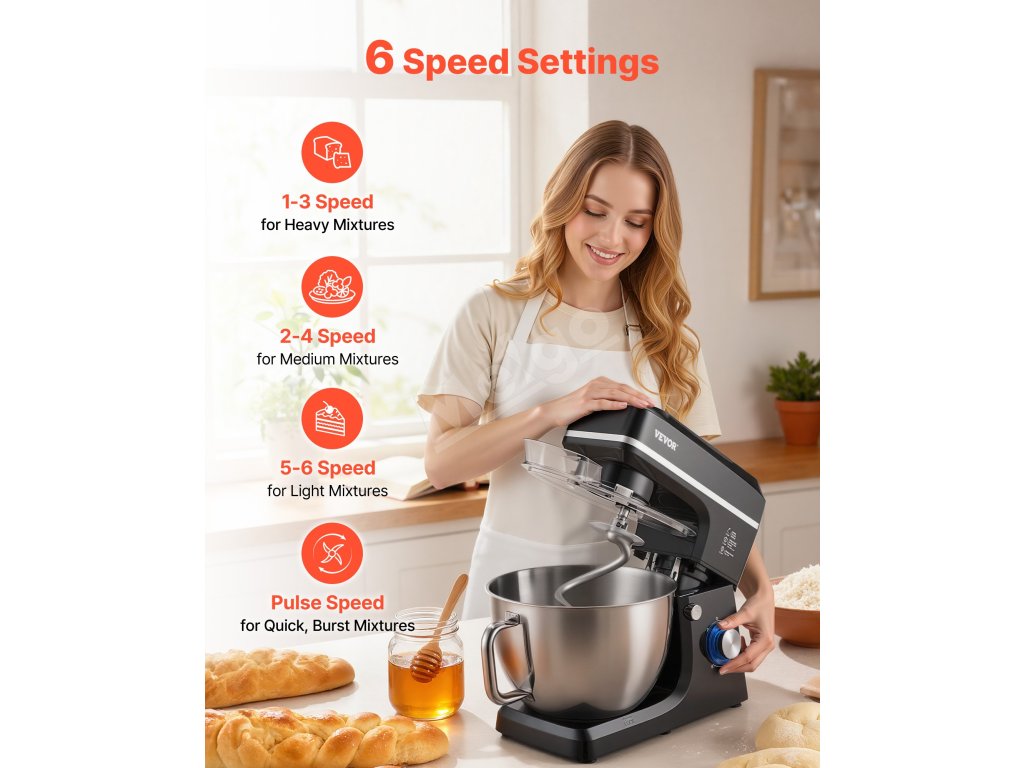 Zbavte sa starostí s prípravou jedla s naším stojanovým mixérom. Vďaka priestrannej miešacej mise s objemom 8,3 qt (7,84 l) zvládnete bez námahy veľké dávky. vďaka 6 rýchlostiam, pulznej funkcii a 3 nástavcom je ideálny na všetky ingrediencie. Vyrobený z robustného kovu a nehrdzavejúcej ocele pre dlhotrvajúcu odolnosť.