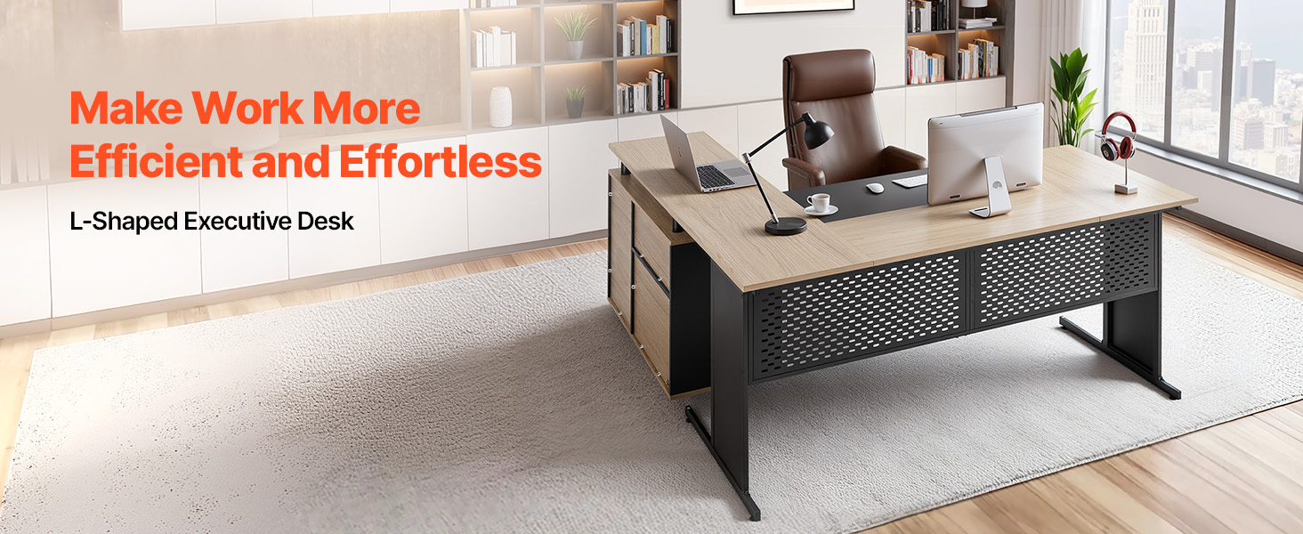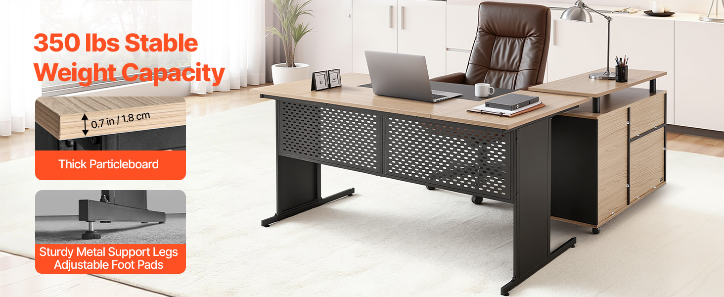 Manažérsky stôl v tvare L kombinuje hrubú drevenú dosku s pevnou drevotrieskovou základňou. Ľahko sa naň zmestia počítače, tlačiarne a iné kancelárske vybavenie, čím sa zabezpečí trvalá stabilita a zároveň sa zabráni kolísaniu aj pri dlhšom používaní.