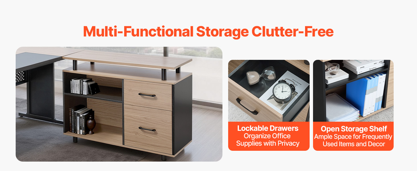 Tento veľký písací stôl v tvare L s úložným priestorom je vybavený praktickými otvorenými policami a priestrannými zásuvkami na prehľadné uloženie kancelárskych potrieb. Udržuje váš pracovný priestor čistý a uprataný, čím zvyšuje efektivitu a pohodlie pre produktívnejší pracovný deň.