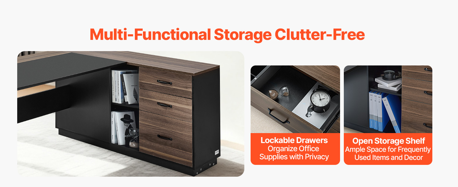 Tento veľký písací stôl v tvare L s úložným priestorom je vybavený praktickými otvorenými policami a priestrannými zásuvkami na prehľadné uloženie kancelárskych potrieb. Udržuje váš pracovný priestor čistý a uprataný, čím zvyšuje efektivitu a pohodlie pre produktívnejší pracovný deň.