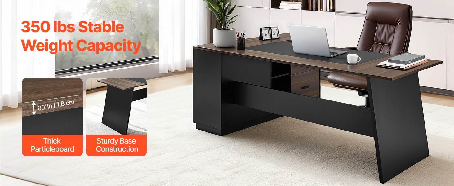 Tento manažérsky stôl s viacerými zásuvkami a úložnými priehradkami umožňuje udržiavať poriadok v súboroch a kancelárskych potrebách. Pracovný stôl je vyrobený z odolnej drevotrieskovej dosky a zostáva stabilný na dlhodobé používanie, takže je ideálnym riešením pre vašu pracovňu alebo domácu kanceláriu.