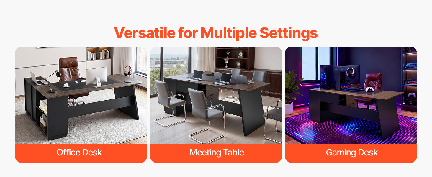 Tento veľký stôl v tvare L slúži ako počítačový stôl, kancelársky stôl, konferenčný stôl, herný stôl alebo jedálenský stôl. Jeho jednoduchý, prispôsobivý dizajn sa hodí k rôznym štýlom interiéru, takže je ideálny na domáce a kancelárske použitie.
