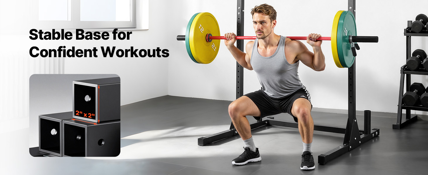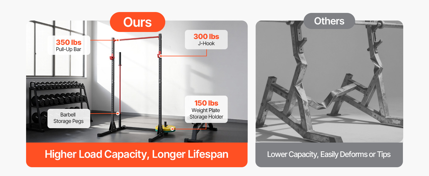 Tento squat rack pre domáce posilňovne je vyrobený z vystužených materiálov a má pevnejší rám, odoláva deformácii a zároveň poskytuje vynikajúcu podporu zaťaženia a dlhodobú odolnosť, vďaka čomu môžete trénovať s väčšou istotou.