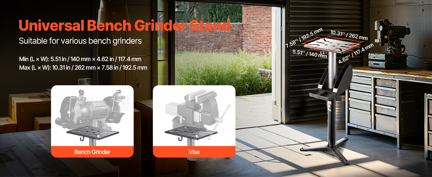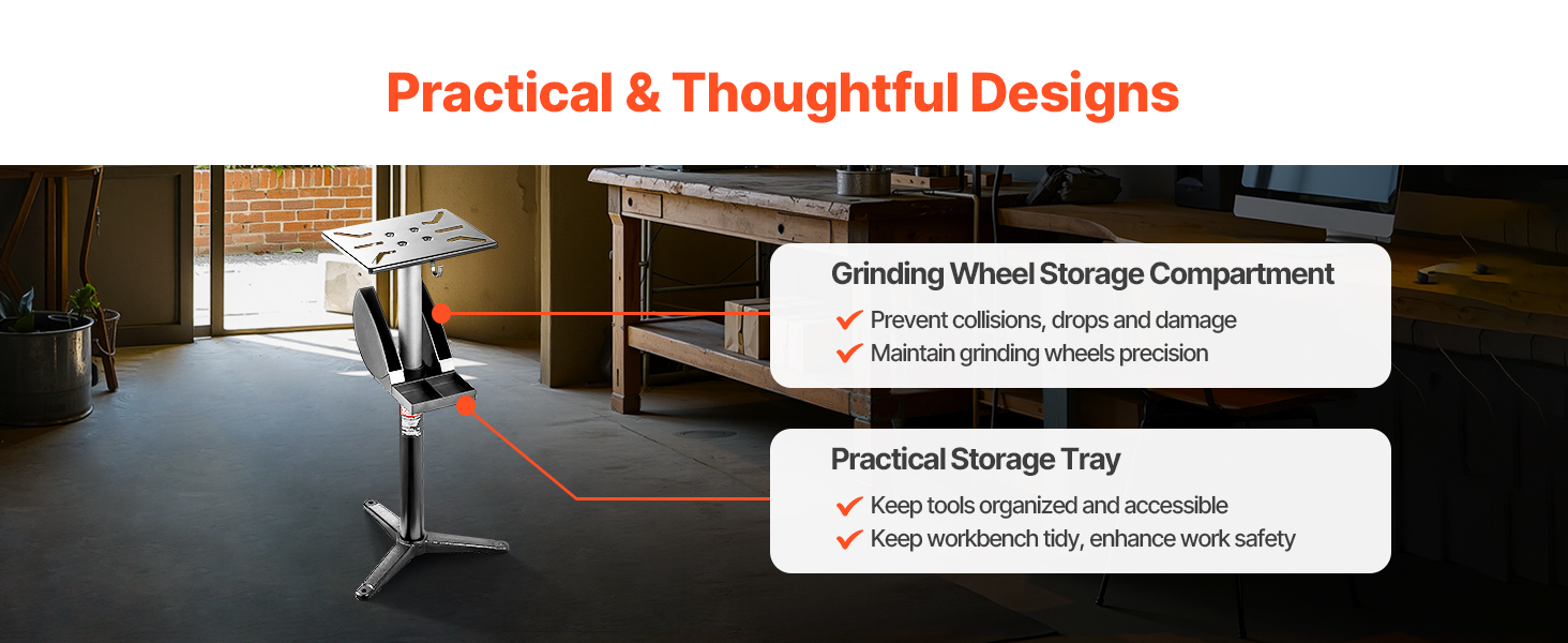 Tento nastaviteľný stojan stolovej brúsky je vybavený 2 úložnými priestormi na brúsne kotúče, ktoré zabraňujú kolíziám alebo pádom kotúčov pri zachovaní presnosti. A odkladacia priehradka na nástroje zaisťuje, že základné nástroje sú na dosah, a udržiava pracovný priestor uprataný.