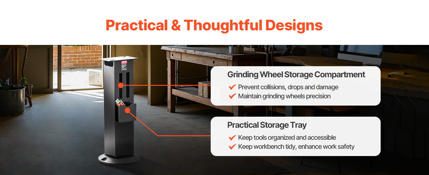 Tento stojan stolovej brúsky má 2 zabudované odkladacie priestory na brúsne kotúče, ktoré zabraňujú kolíziám alebo pádom kotúčov pri zachovaní presnosti. A odkladacia priehradka na náradie zaisťuje, že základné nástroje sú na dosah a udržiava pracovný priestor uprataný.