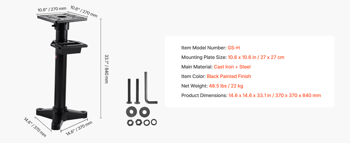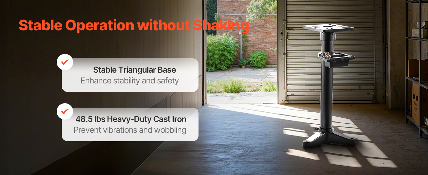 Tento podlahový podstavec pre stolové brúsky, vyrobený z liatiny a ocele s vysokou hmotnosťou 48,5 lbs (22 kg), poskytuje stabilnú oporu, znižuje vibrácie počas prevádzky a zabezpečuje stabilné a presné brúsenie.