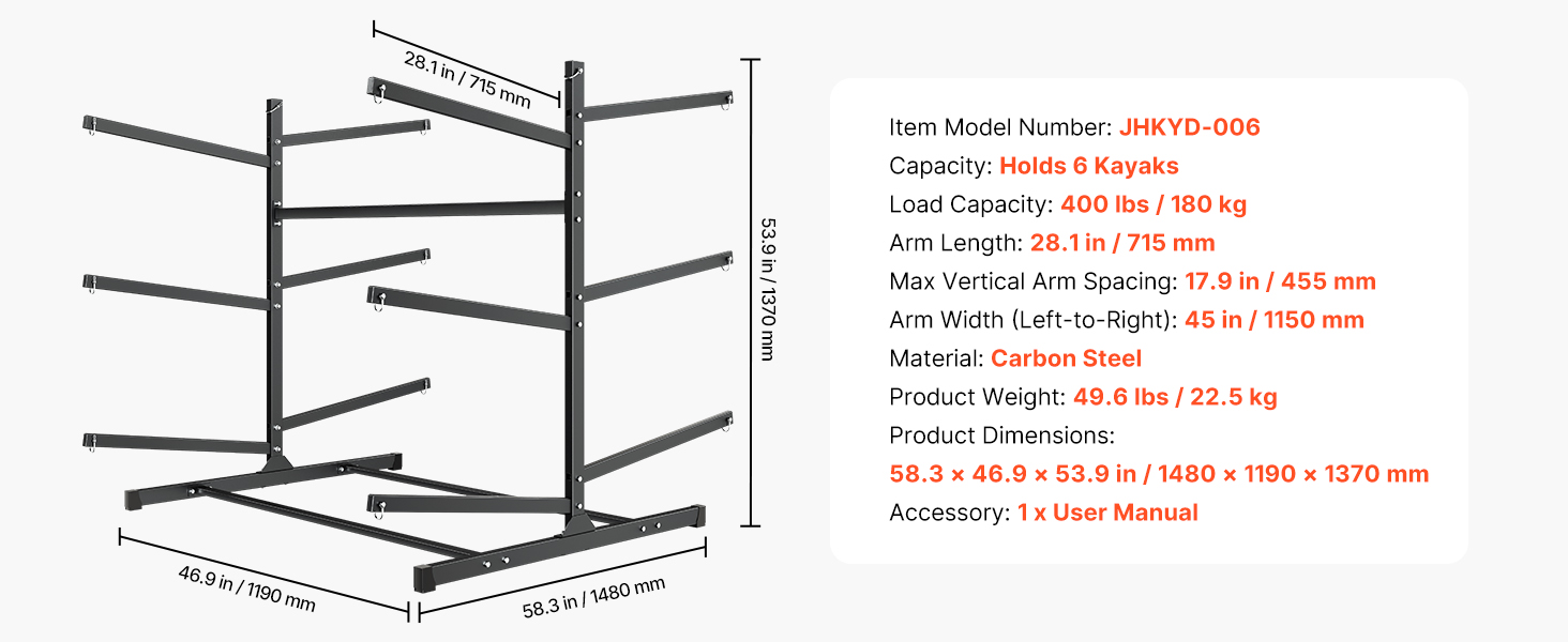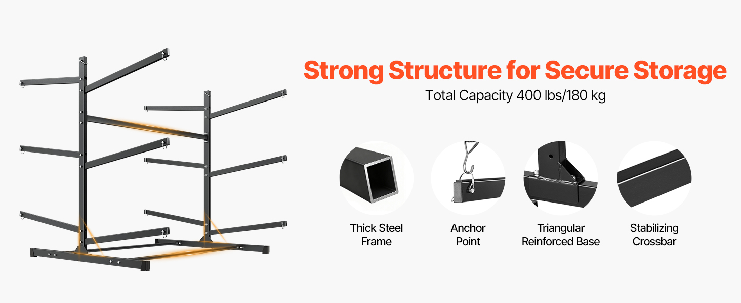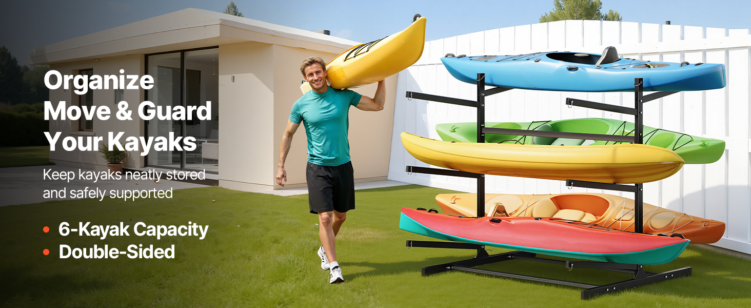 Dlhé ramená a ich široký rozstup sa prispôsobujú rôznym tvarom a veľkostiam kajakov, čím poskytujú správnu oporu bez namáhania trupu. Tento univerzálny stojan na kajaky je ideálny na vonkajšie skladovanie kajakov, kánoí a dosiek SUP.