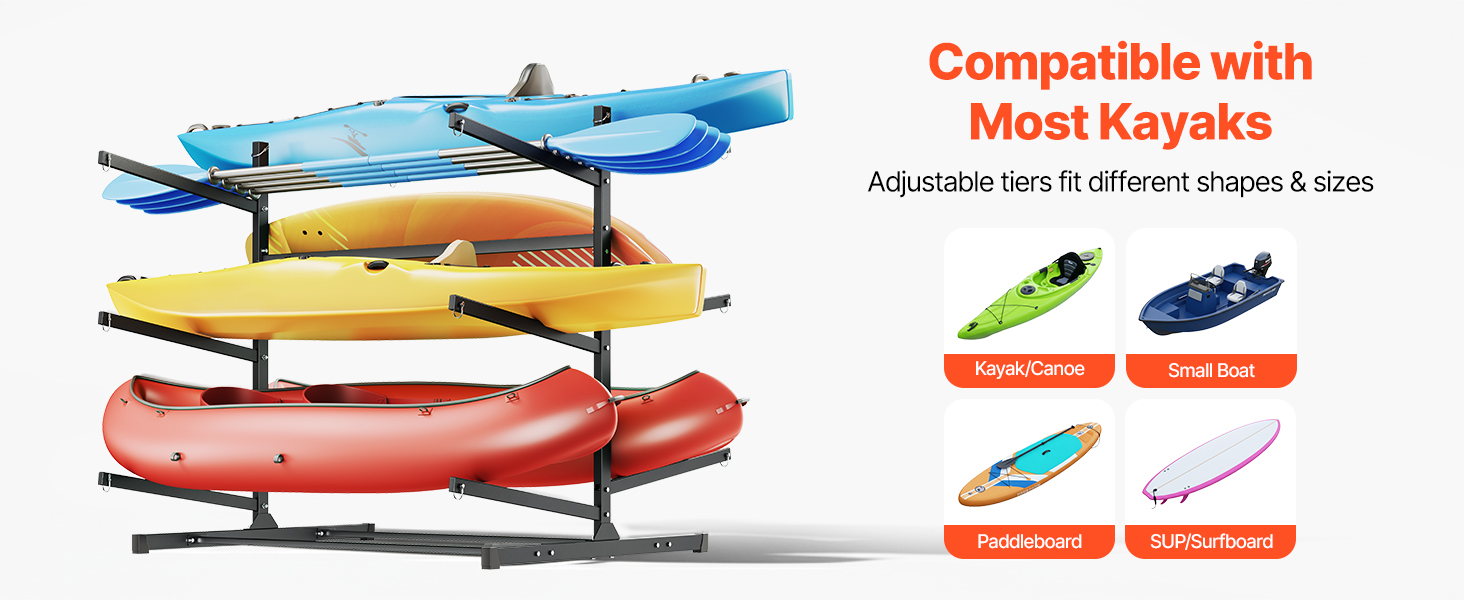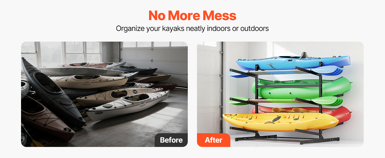Náš stojan na kajaky ponúka prehľadné vertikálne skladovanie vďaka voľne stojacej konštrukcii. Viacúrovňové usporiadanie pomáha chrániť vaše kajaky, znižuje neporiadok a udržiava váš priestor uprataný a prístupný.