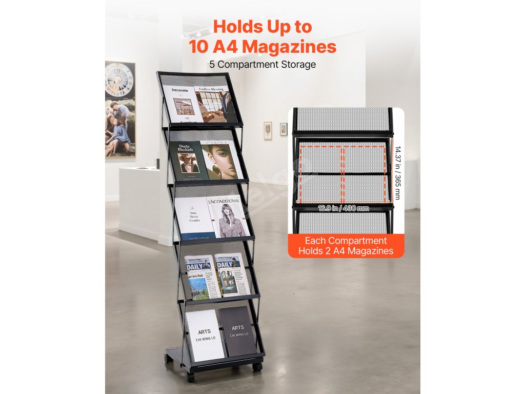 Skladací stojan na brožúry a časopisy, 5 vreciek, kovový, na kolieskach