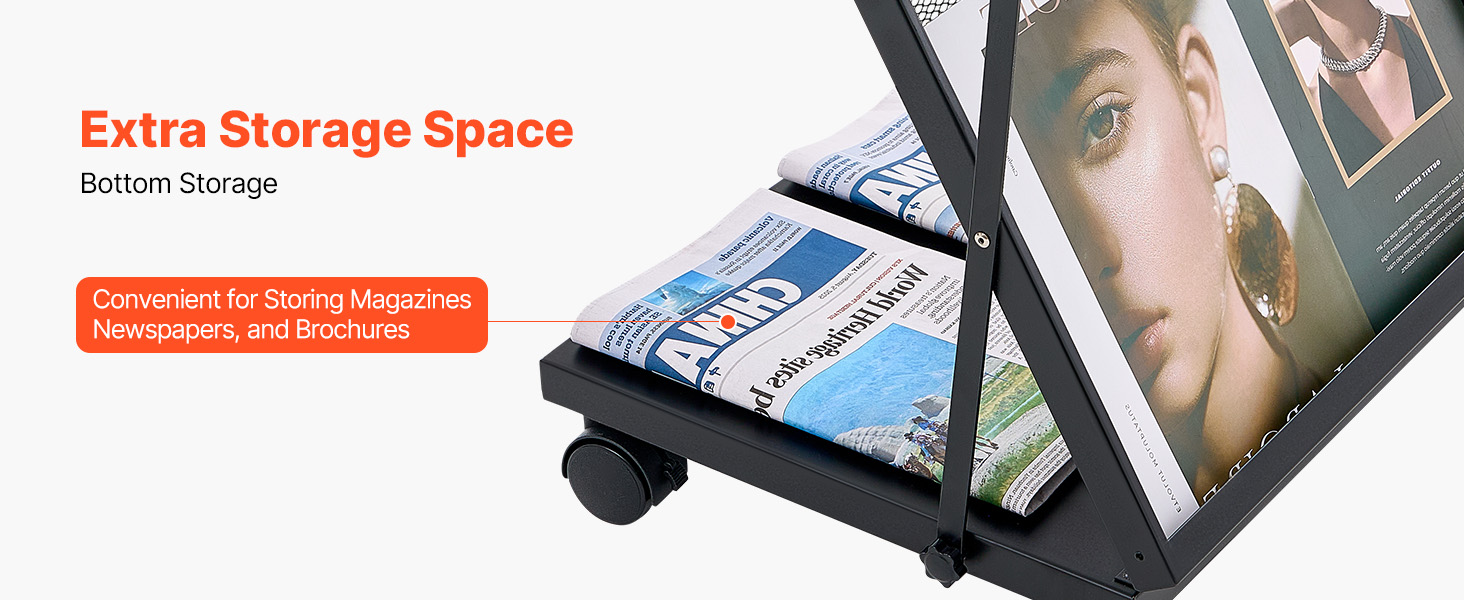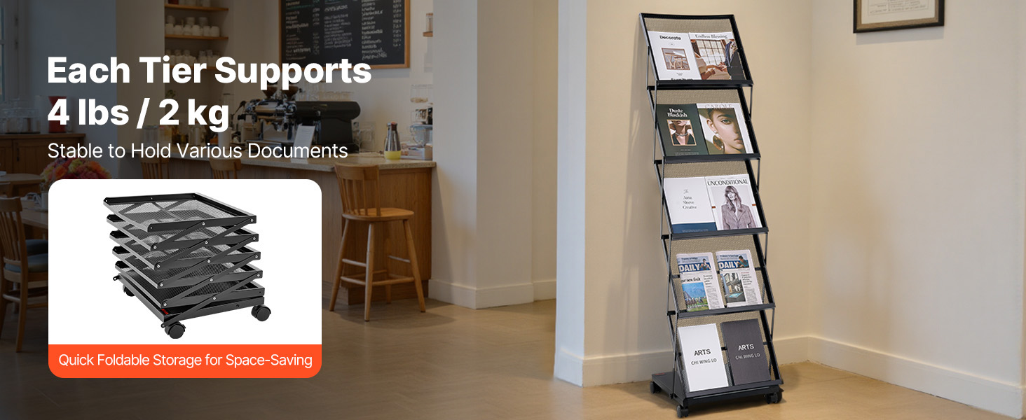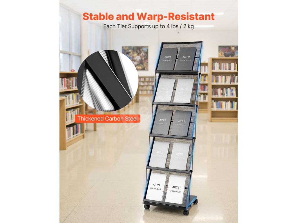 Každá vrstva unesie až 4 lbs/2 kg, čím ľahko podporí dokumenty, materiály a brožúry rôznej hrúbky. Aj pri viacerých zložkách uložených na sebe stojí stojan na vystavenie literatúry pevne bez obáv z pádu alebo naklonenia. Silná nosnosť zaručuje stabilitu a spoľahlivosť.