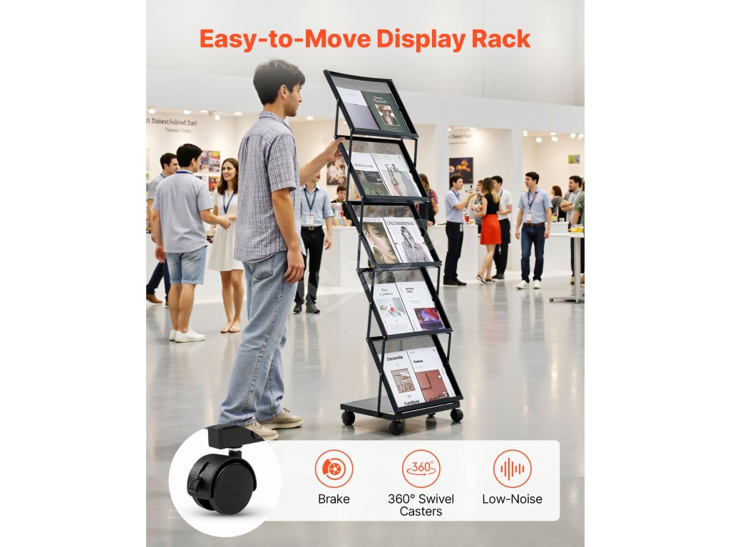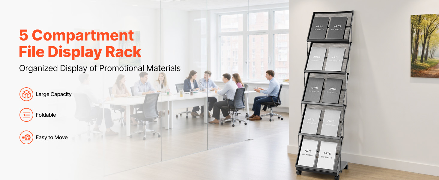 Tento stojan na brožúry s 5 priehradkami vám pomôže ľahko usporiadať a vystaviť rôzne propagačné materiály, dokumenty, časopisy atď. Či už v kanceláriách, zasadacích miestnostiach alebo knižniciach, udržiava materiály prehľadne viditeľné, čím zvyšuje efektivitu práce a účinnosť zobrazovania.