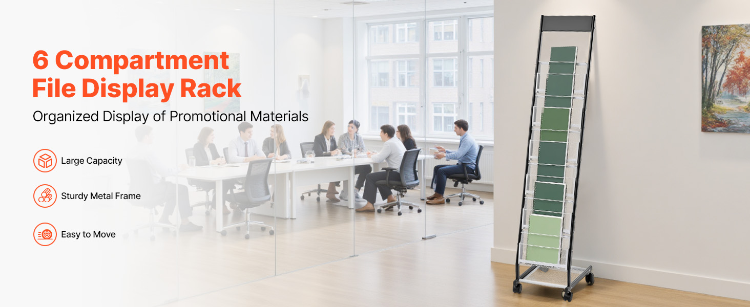 Tento stojan na brožúry so 6 priehradkami vám pomôže jednoducho usporiadať a vystaviť rôzne propagačné materiály, dokumenty, časopisy atď. Či už v kanceláriách, zasadacích miestnostiach alebo knižniciach, udržiava materiály prehľadne viditeľné, čím zvyšuje efektivitu práce a účinnosť zobrazovania.