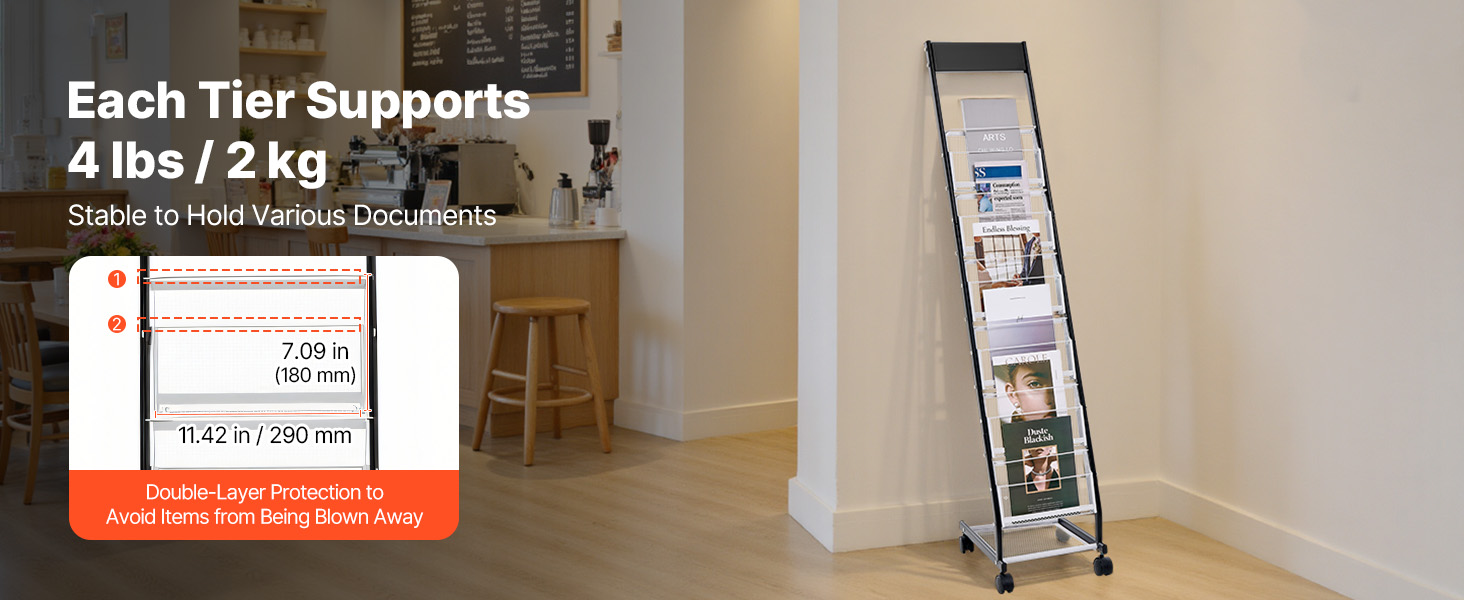 Každá vrstva unesie až 4 lbs/2 kg, čím ľahko podporí dokumenty, materiály a brožúry rôznej hrúbky. Aj pri viacerých zložkách uložených na sebe stojí stojan na vystavenie literatúry pevne bez obáv z pádu alebo naklonenia. Silná nosnosť zaručuje stabilitu a spoľahlivosť.