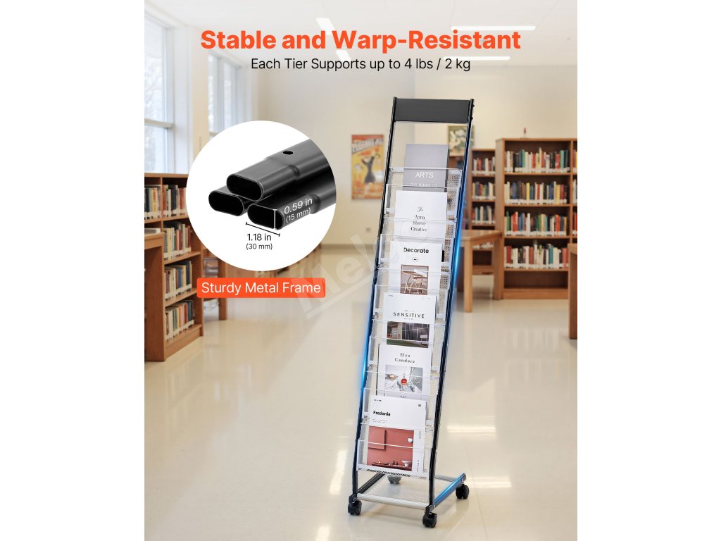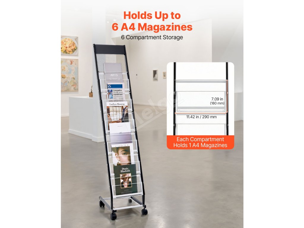 Tento stojan na brožúry so 6 priehradkami vám pomôže jednoducho usporiadať a vystaviť rôzne propagačné materiály, dokumenty, časopisy atď. Či už v kanceláriách, zasadacích miestnostiach alebo knižniciach, udržiava materiály prehľadne viditeľné, čím zvyšuje efektivitu práce a účinnosť zobrazovania.