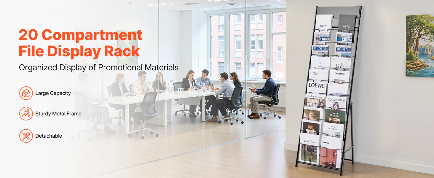 Tento stojan na brožúry s 20 priehradkami vám pomôže ľahko usporiadať a vystaviť rôzne propagačné materiály, dokumenty, časopisy atď. Či už v kanceláriách, zasadacích miestnostiach alebo knižniciach, udržiava materiály prehľadne viditeľné, čím zvyšuje efektivitu práce a účinnosť zobrazovania.