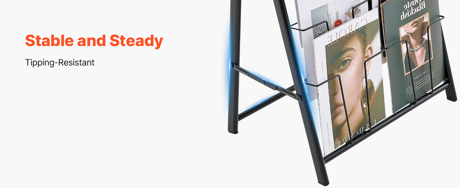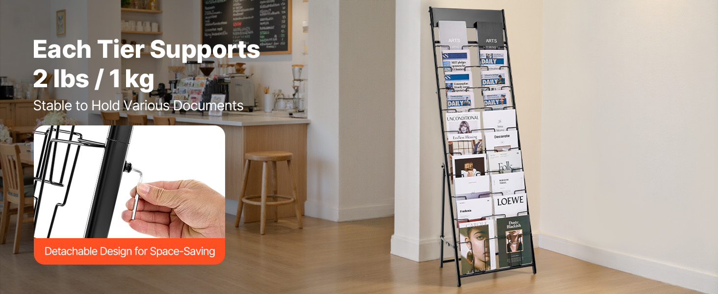 Každá vrstva unesie až 2 lbs/1 kg, čím ľahko podporí dokumenty, materiály a brožúry rôznej hrúbky. Aj pri viacerých zložkách uložených na sebe stojí stojan na vystavenie literatúry pevne bez obáv z pádu alebo naklonenia. Silná nosnosť zaručuje stabilitu a spoľahlivosť.