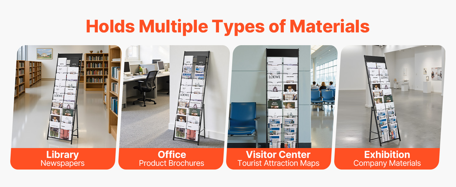 Vhodný na ukladanie a vystavovanie rôznych typov materiálov vrátane dokumentov, brožúr, časopisov, príručiek atď. Spĺňa potreby rôznych scenárov použitia a má dostatok priestoru, ktorý vám pomôže efektívne spravovať a vystavovať rôzne materiály.