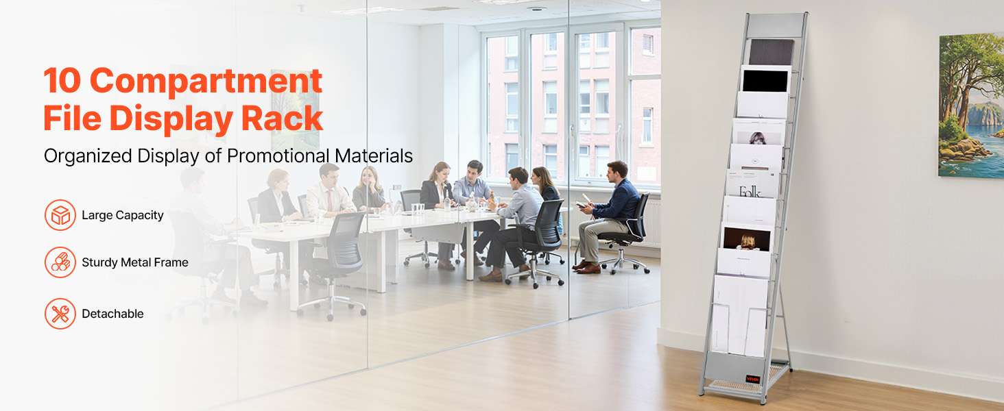 Tento stojan na brožúry s 10 priehradkami vám pomôže ľahko usporiadať a vystaviť rôzne propagačné materiály, dokumenty, časopisy atď. Či už v kanceláriách, zasadacích miestnostiach alebo knižniciach, udržiava materiály prehľadne viditeľné, čím zvyšuje efektivitu práce a účinnosť zobrazovania.