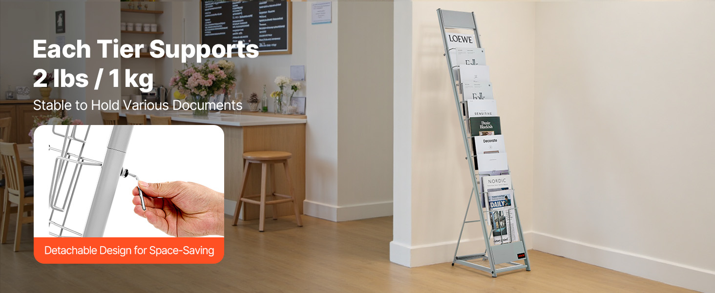 Každá vrstva unesie až 2 lbs/1 kg, čím ľahko podporí dokumenty, materiály a brožúry rôznej hrúbky. Aj pri viacerých zložkách uložených na sebe stojí stojan na vystavenie literatúry pevne bez obáv z pádu alebo naklonenia. Silná nosnosť zaručuje stabilitu a spoľahlivosť.