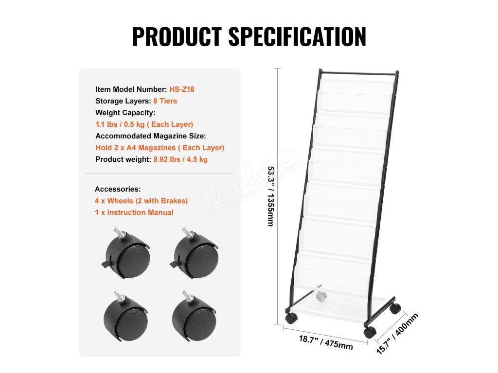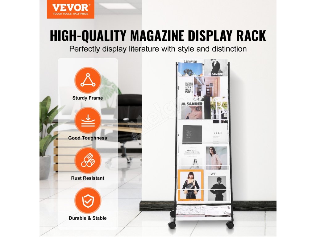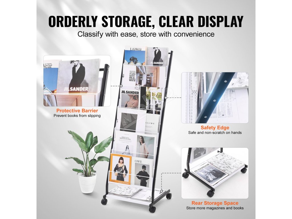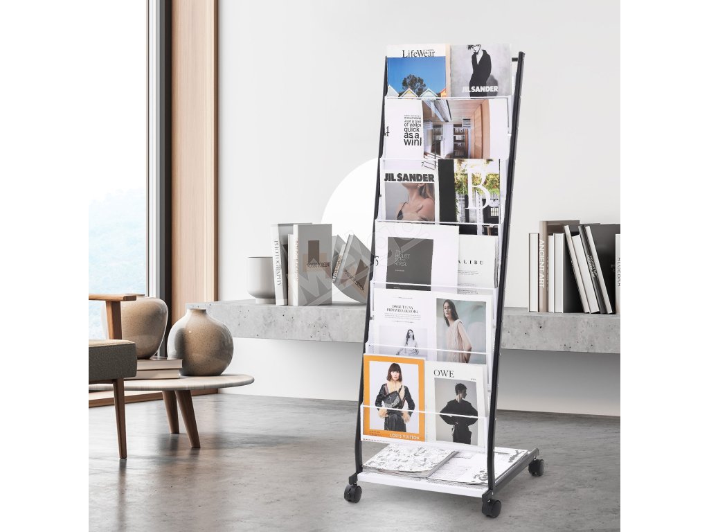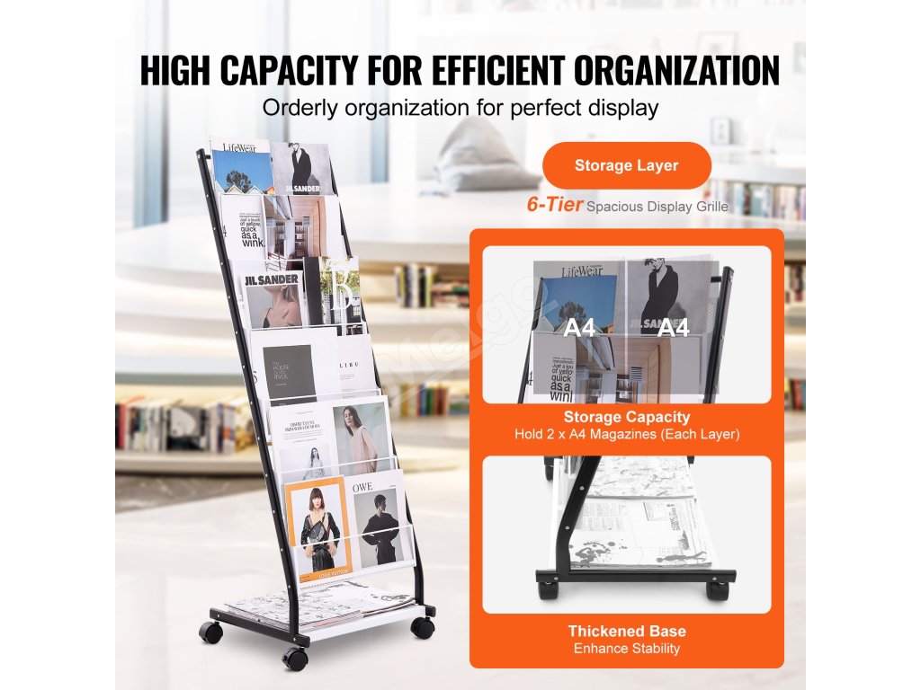 Majte všetky svoje propagačné materiály usporiadané a vystavené! Stojan na časopisy VEVOR s kolieskami sa môže pochváliť 6 úrovňami priestranného úložného priestoru, pričom každá úroveň pojme 2 x časopisy formátu A4, čo zaručuje dostatok priestoru na prezentáciu vašich časopisov, brožúr a súborov.