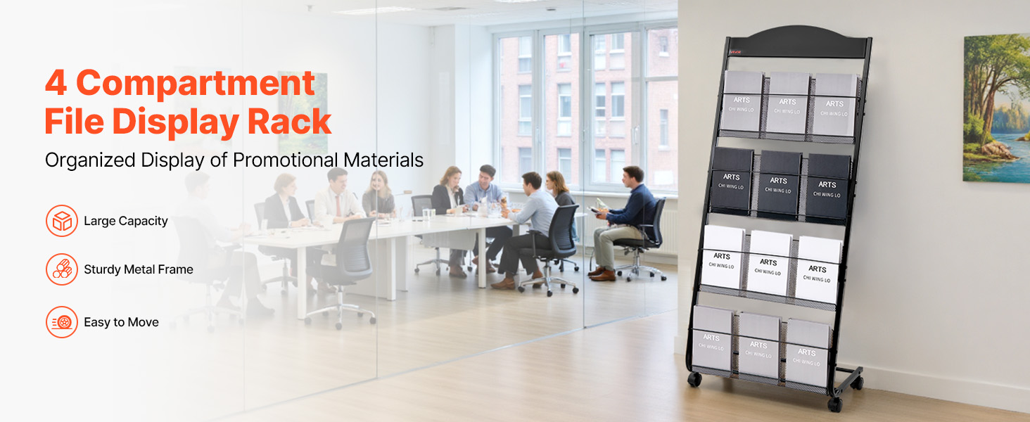 Tento stojan na brožúry so 4 priehradkami vám pomôže jednoducho usporiadať a vystaviť rôzne propagačné materiály, dokumenty, časopisy atď. Či už v kanceláriách, zasadacích miestnostiach alebo knižniciach, udržiava materiály prehľadne viditeľné, čím zvyšuje efektivitu práce a účinnosť zobrazovania.