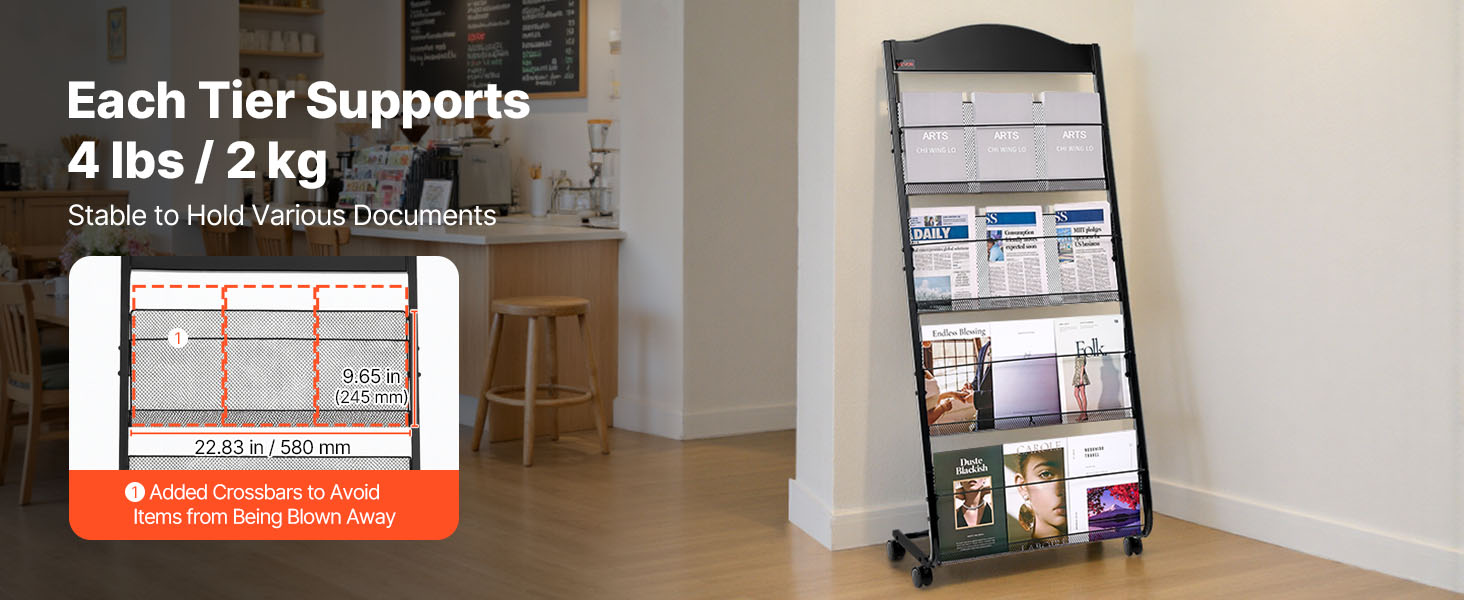 Každá vrstva unesie až 4 lbs/2 kg, čím ľahko podporí dokumenty, materiály a brožúry rôznej hrúbky. Aj pri viacerých zložkách uložených na sebe stojí stojan na vystavenie literatúry pevne bez obáv z pádu alebo naklonenia. Silná nosnosť zaručuje stabilitu a spoľahlivosť.
