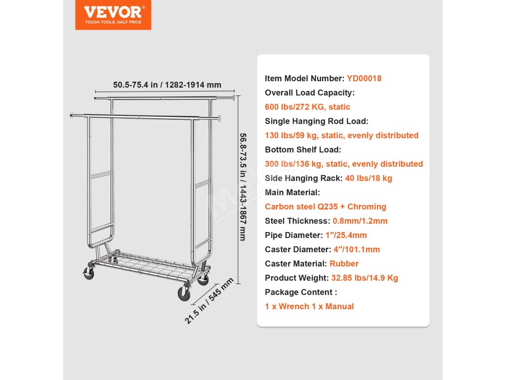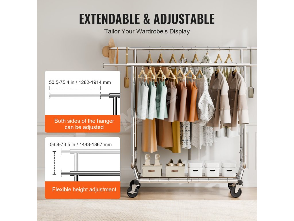 Náš vešiak na oblečenie poskytuje potrebnú flexibilitu vďaka výsuvnej závesnej tyči v rozsahu od 50,5'' do 75,4'' a nastaviteľnej výške od 56,8'' do 73,5''. Môžete si vytvoriť vlastné riešenie úložného priestoru, ktoré dokonale vyhovuje vašim potrebám.