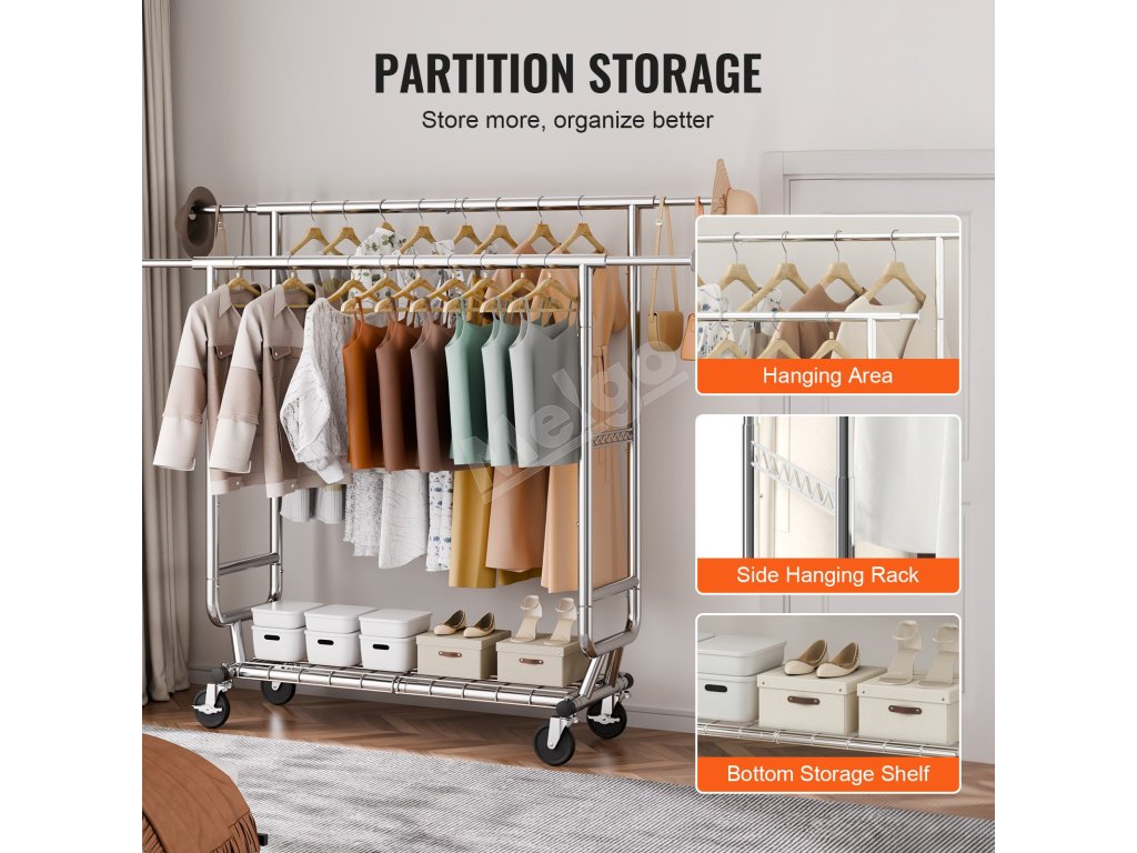 Už vás nebaví hromadenie oblečenia? Priestranný dizajn pojazdného vešiaka na odevy VEVOR pomáha znížiť neporiadok vo vašom obytnom priestore. Namiesto toho, aby ste oblečenie nechávali na stoličkách, posteliach alebo iných povrchoch, môžete ho úhľadne zavesiť na stojan, čím udržíte svoju miestnosť upratanú a bez nevzhľadného neporiadku.