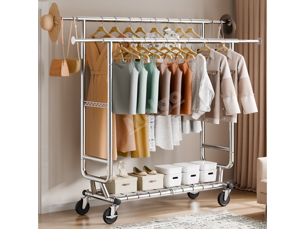 Maximalizujte úložný priestor a organizáciu vďaka dvom závesným tyčiam a spodnej polici stojana na odevy. Dvojité závesné tyče poskytujú dvojnásobnú kapacitu, čo vám umožní uložiť väčší počet odevov, zatiaľ čo spodná polica je ideálna na uloženie topánok, krabíc a doplnkov.