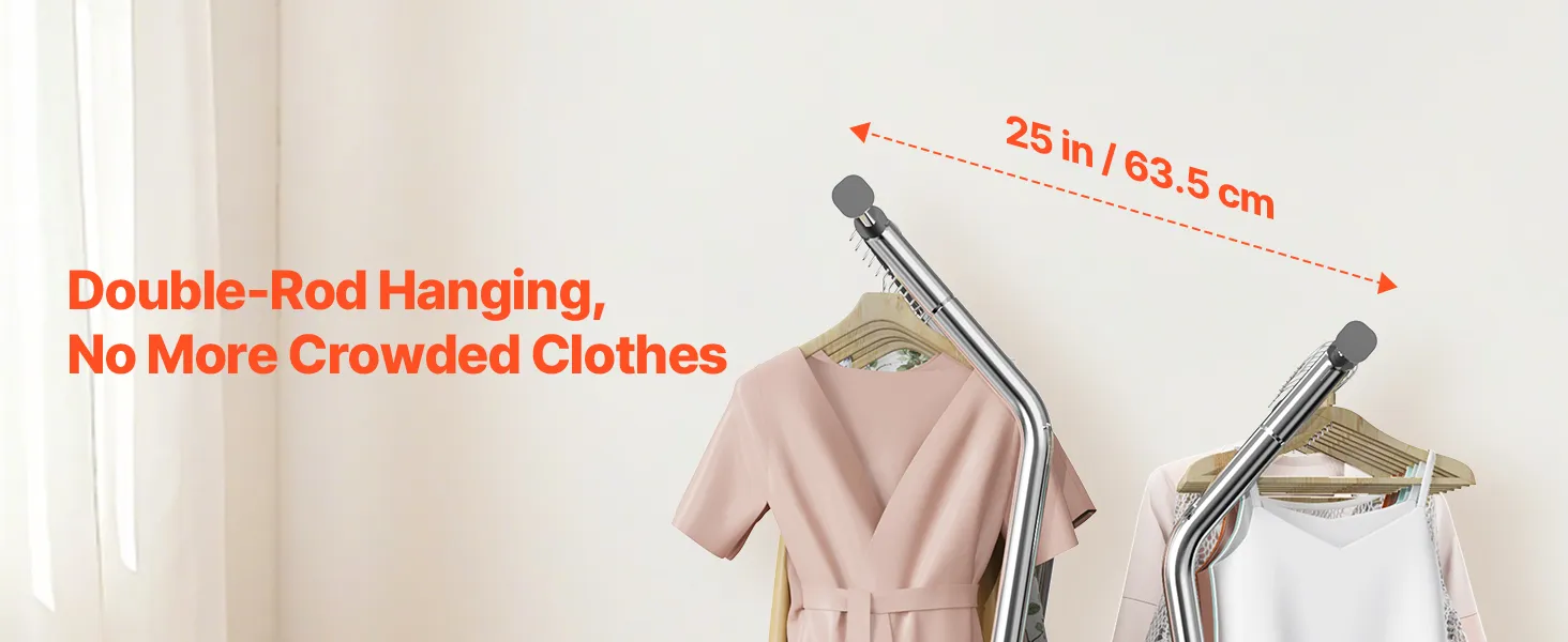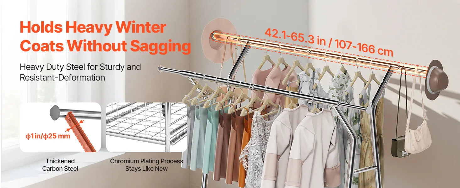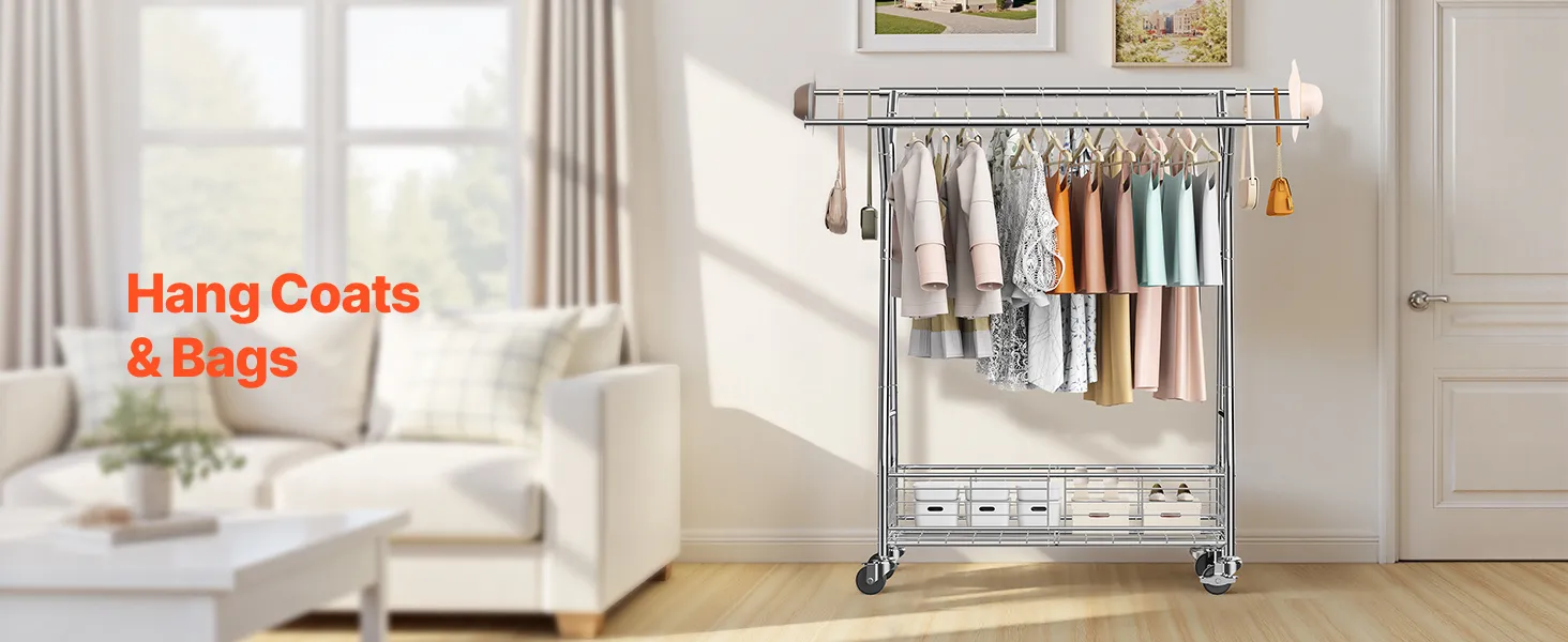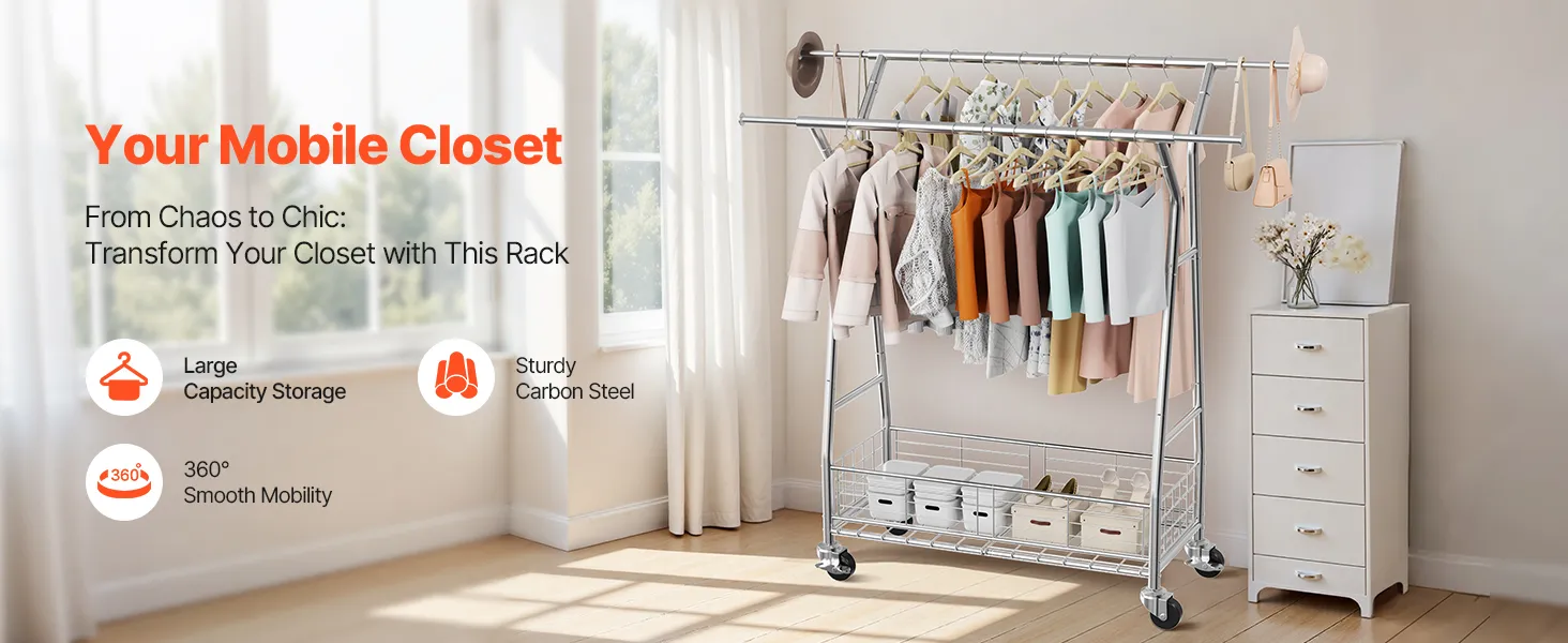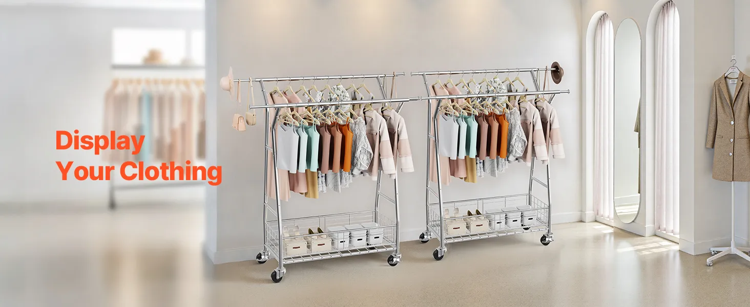 Tento stojan na oblečenie poskytuje dostatok úložného priestoru pre oblečenie všetkých veľkostí. Je vyrobený z odolnej uhlíkovej ocele, ktorá zaručuje stabilitu, a jeho 360° otočné kolieska uľahčujú premiestňovanie a organizáciu odevov.