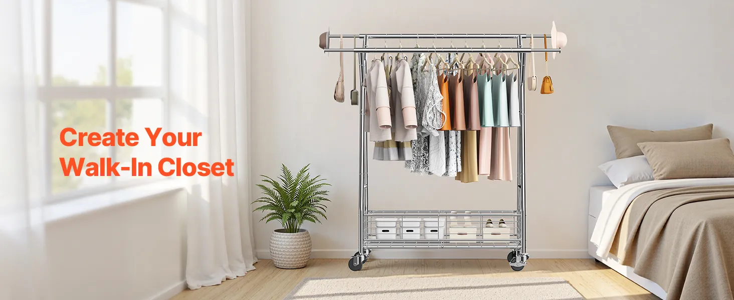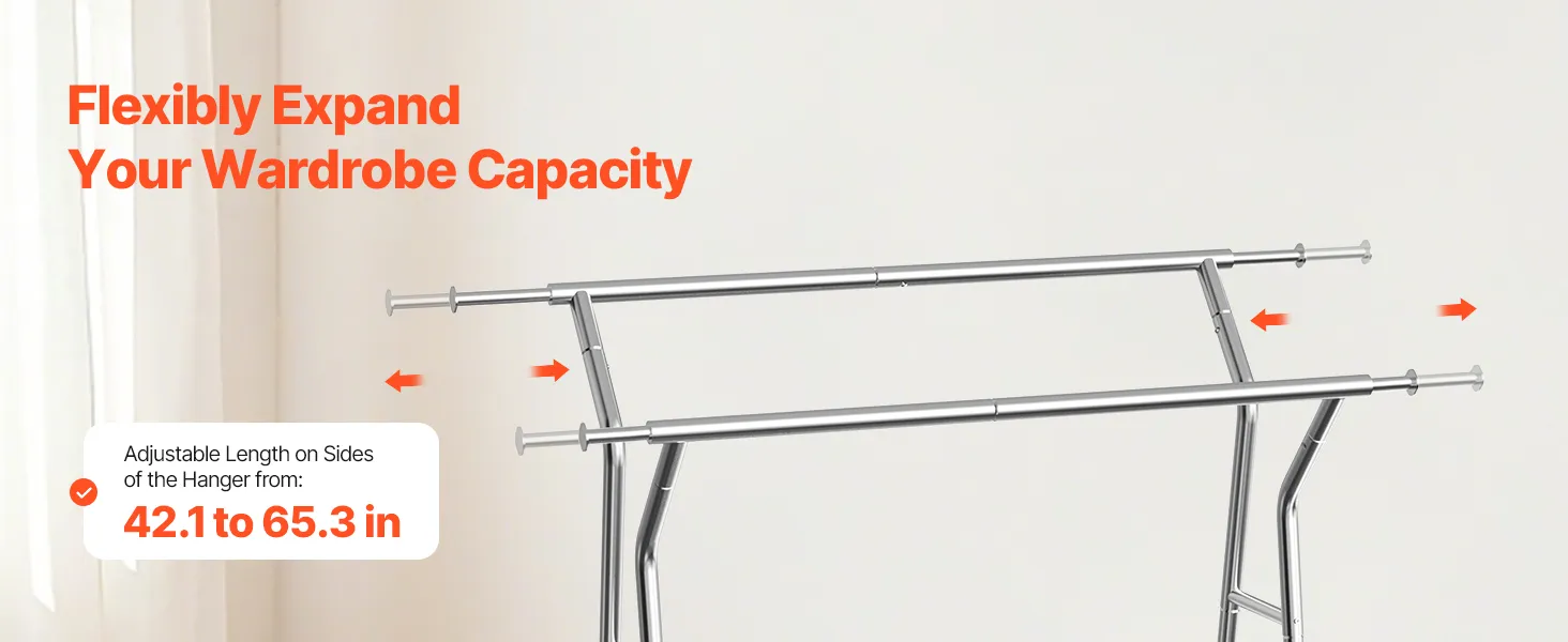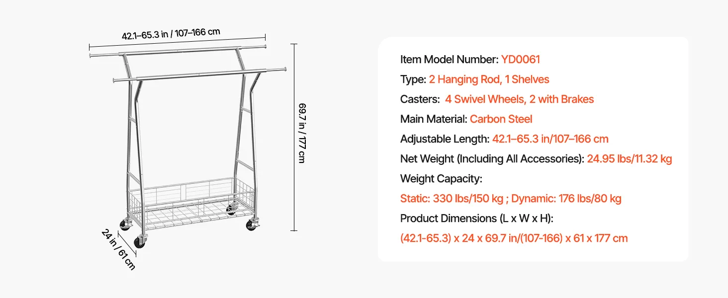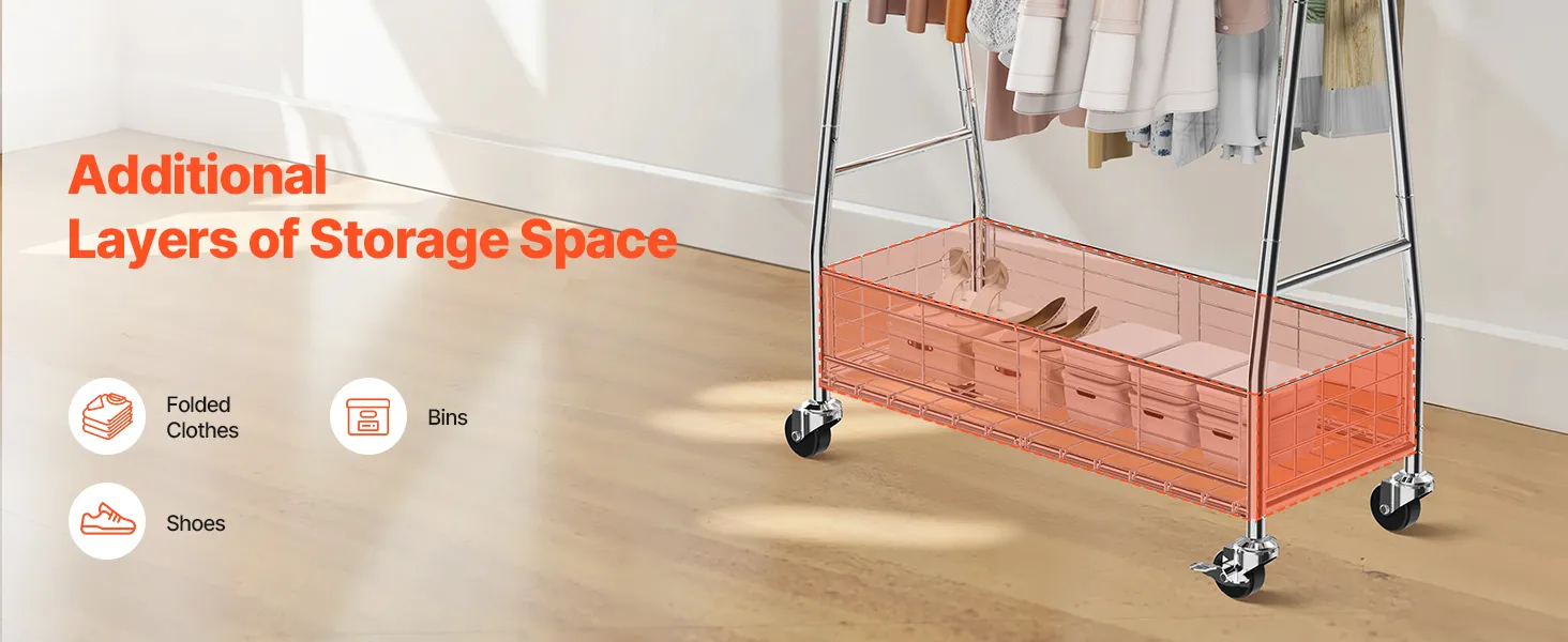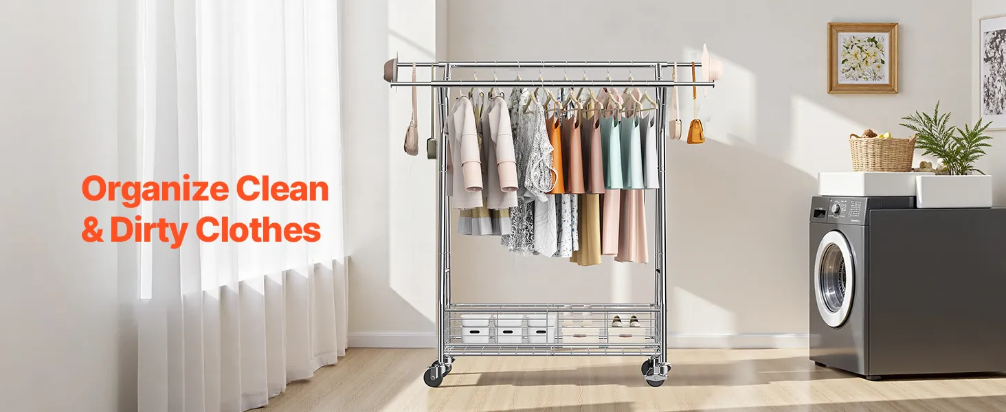 Tento stojan na oblečenie poskytuje dostatok úložného priestoru pre oblečenie všetkých veľkostí. Je vyrobený z odolnej uhlíkovej ocele, ktorá zaručuje stabilitu, a jeho 360° otočné kolieska uľahčujú premiestňovanie a organizáciu odevov.