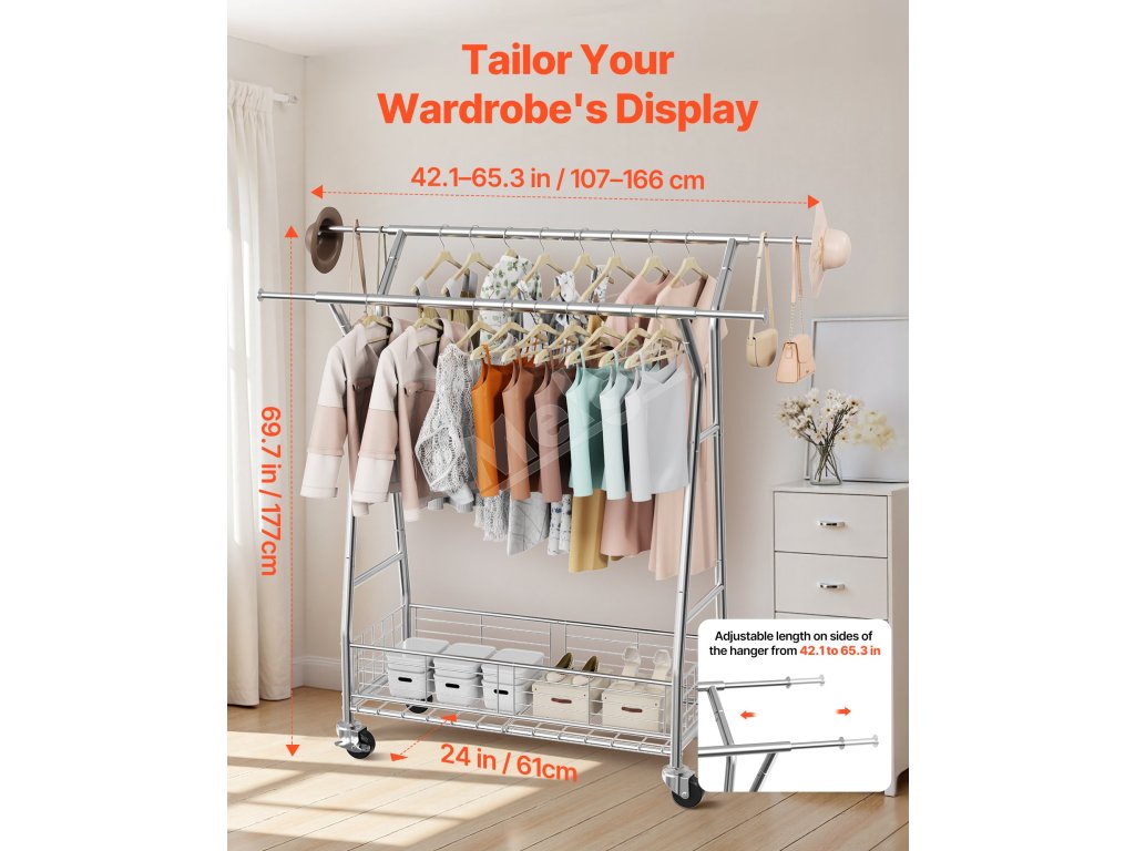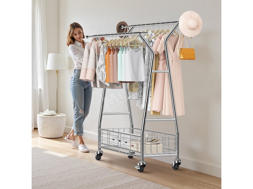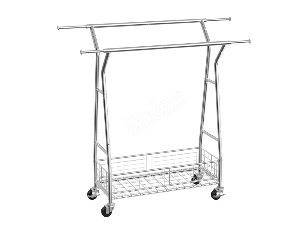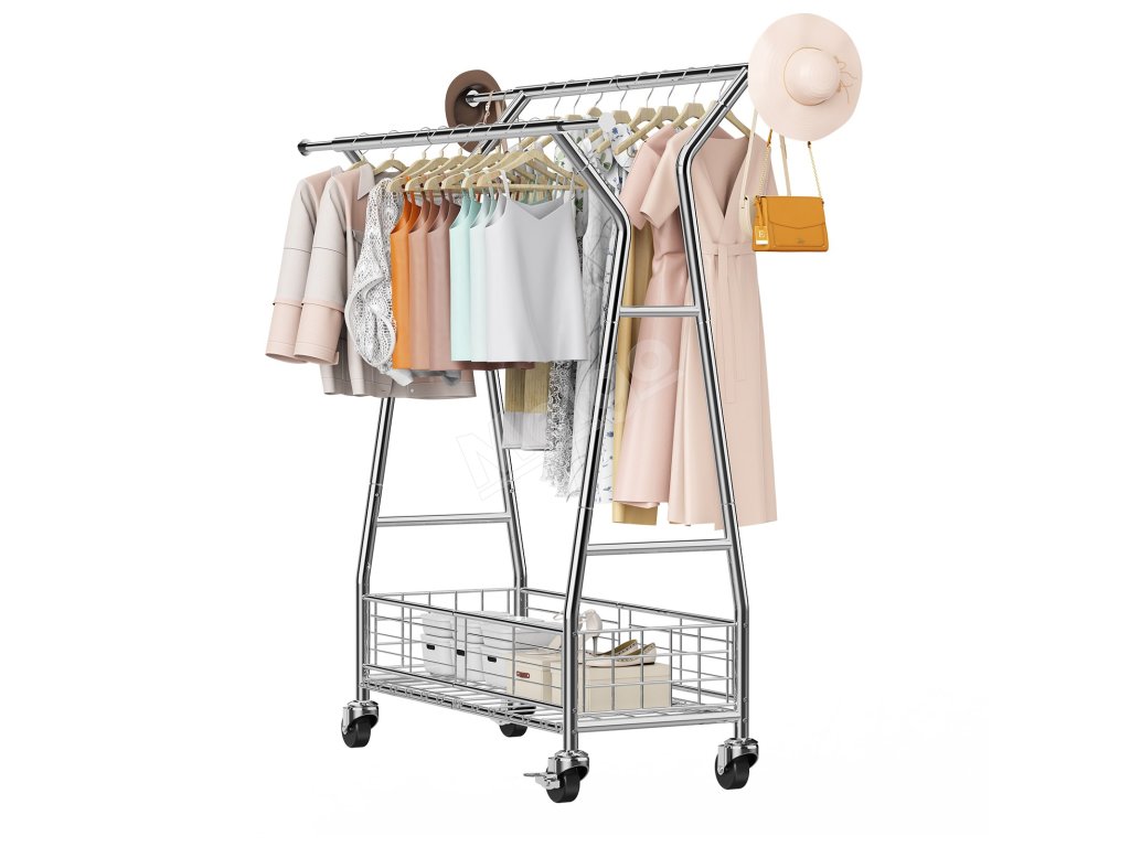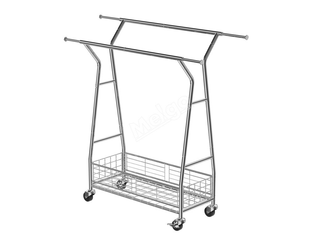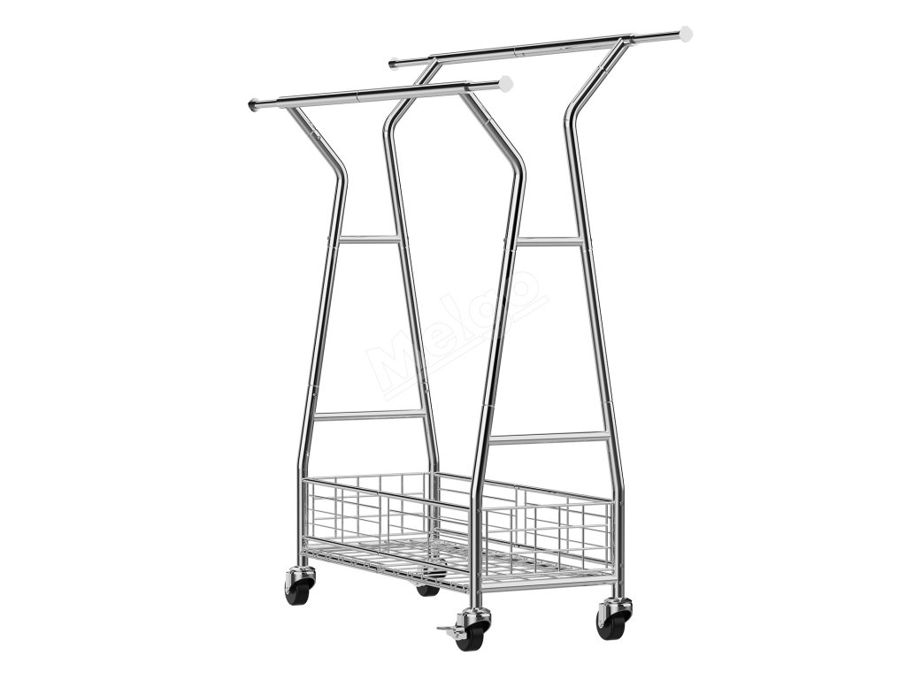Pojazdný stojan na oblečenie s 2 tyčami, košíkom, nosnosť 150 kg