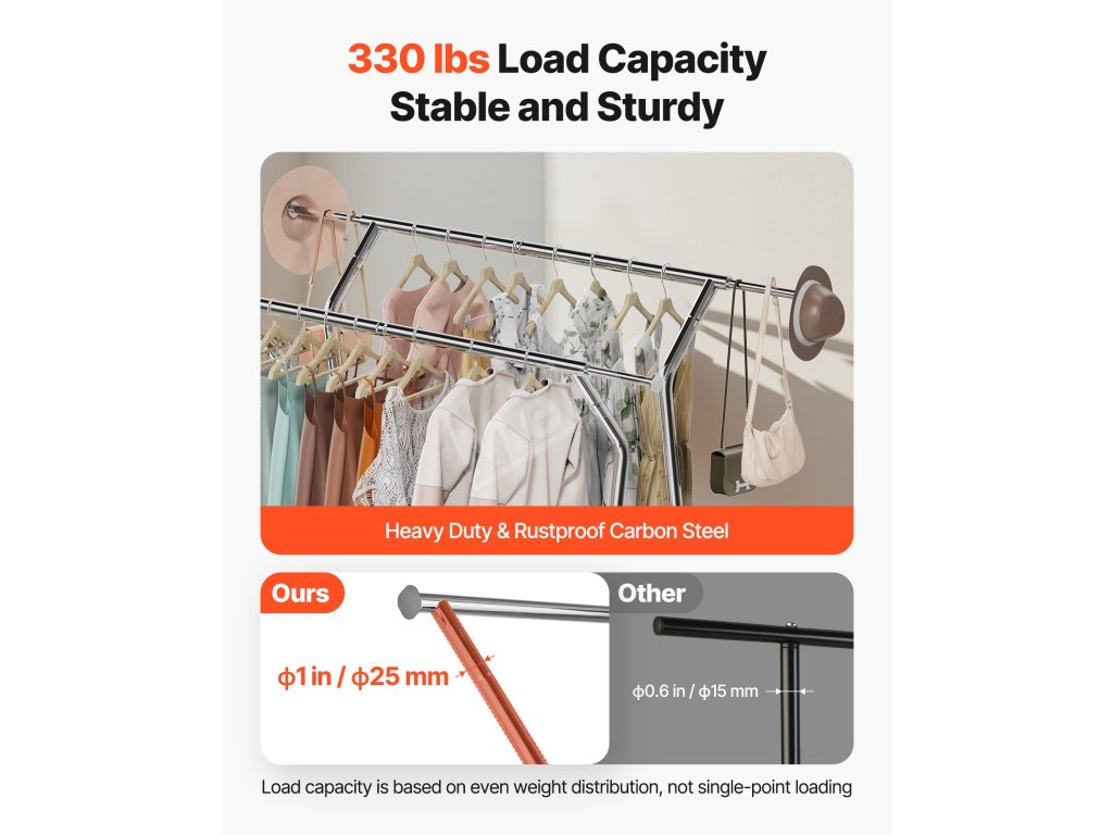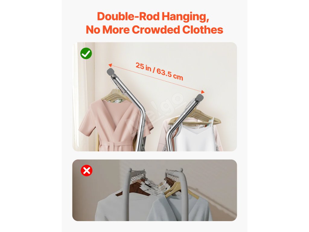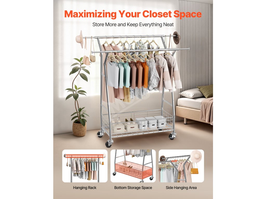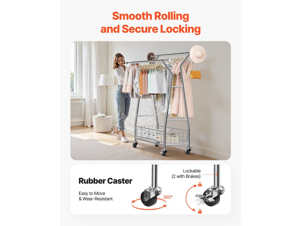 Tento stojan na oblečenie poskytuje dostatok úložného priestoru pre oblečenie všetkých veľkostí. Je vyrobený z odolnej uhlíkovej ocele, ktorá zaručuje stabilitu, a jeho 360° otočné kolieska uľahčujú premiestňovanie a organizáciu odevov.
