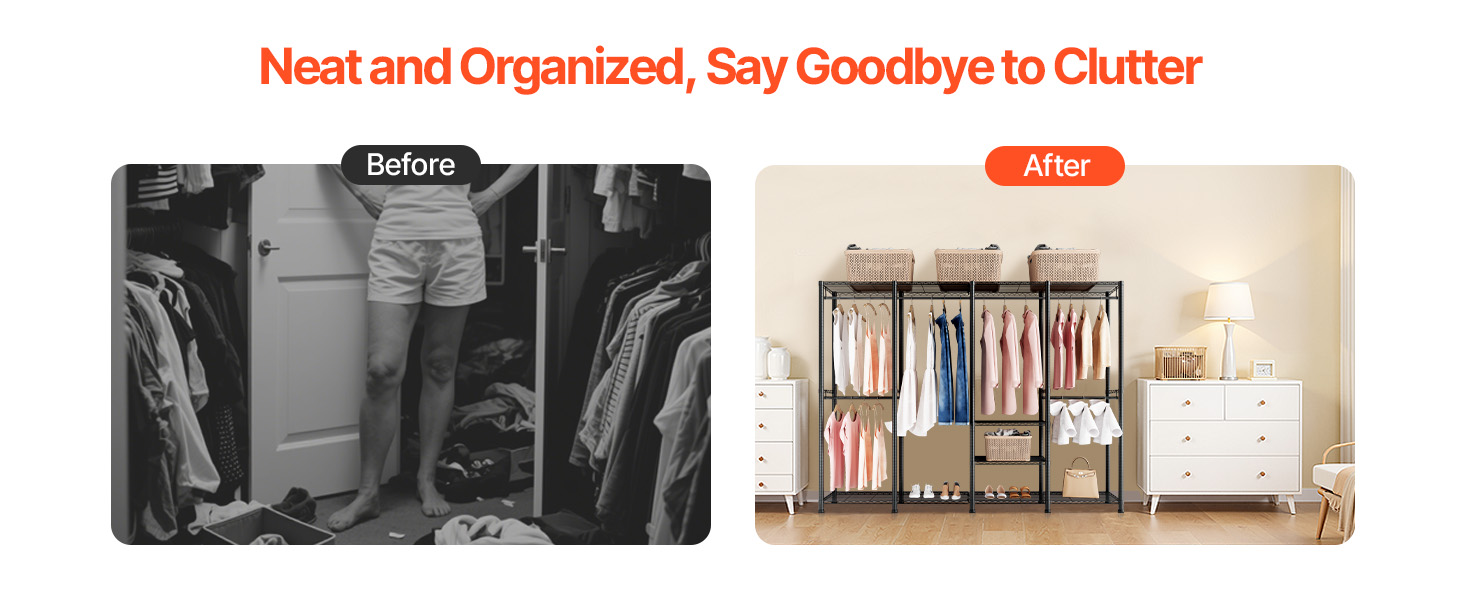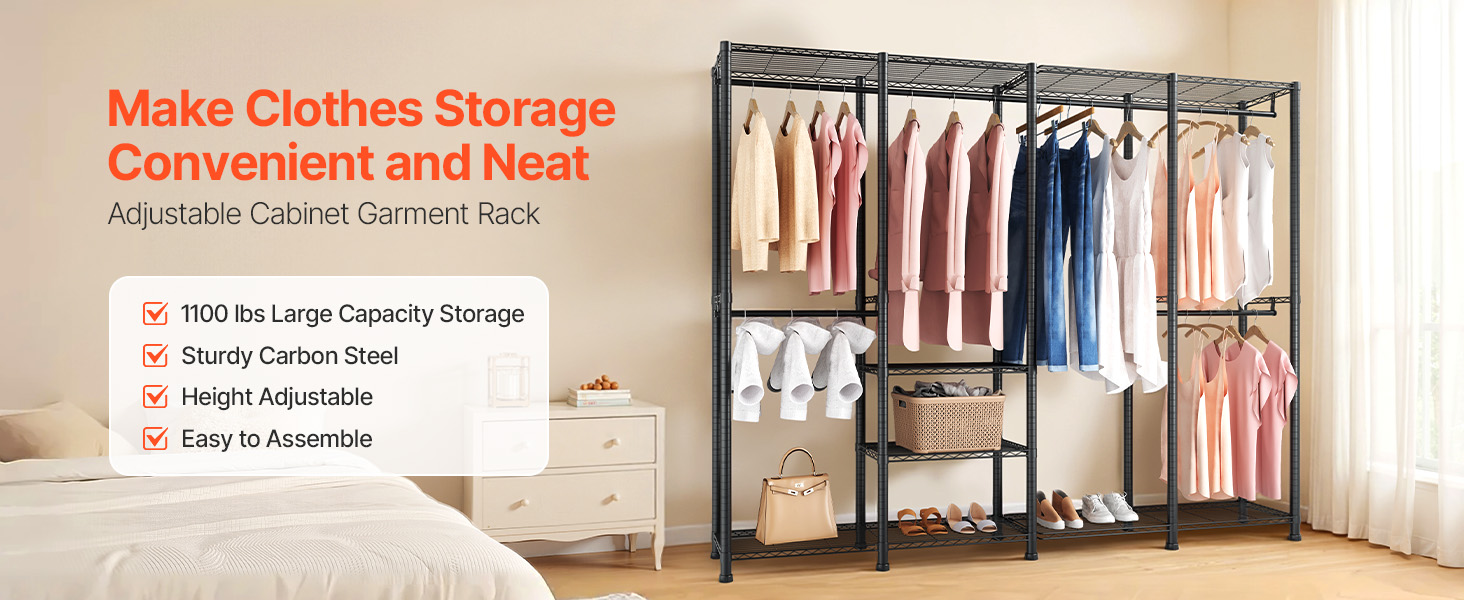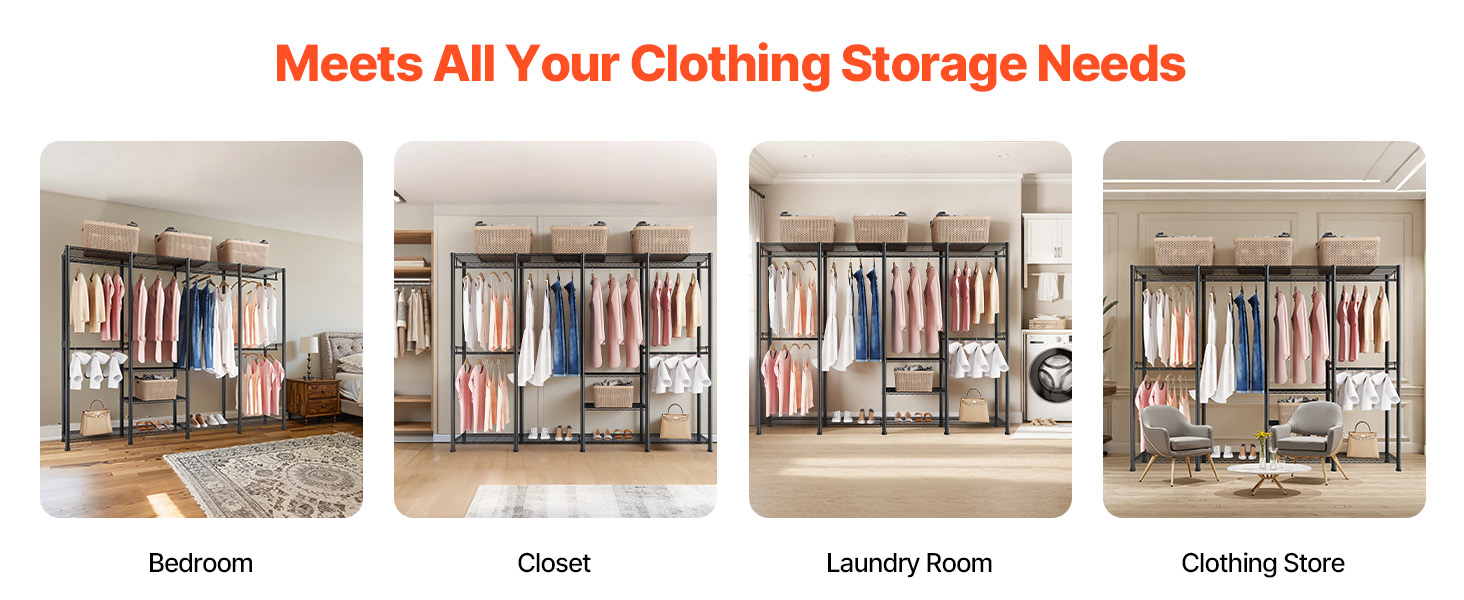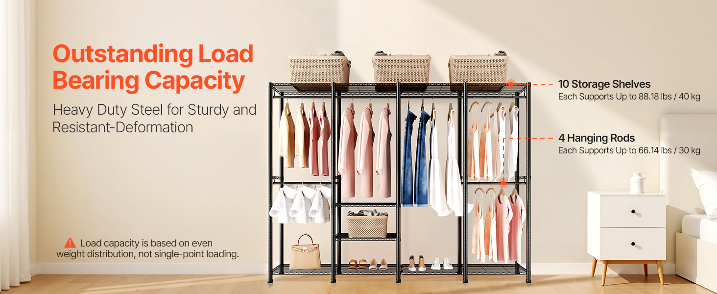 Je vyrobený zo zhrubnutej uhlíkovej ocele s práškovou povrchovou úpravou odolnou proti korózii a hrdzi pre trvalú odolnosť. Robustná konštrukcia zaručuje, že každá polica a závesná tyč ľahko unesie každodenné oblečenie a predmety a ponúka spoľahlivé skladovanie a používanie.