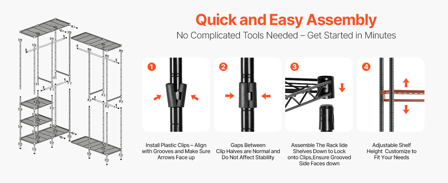 Tento závesný vešiak na oblečenie, navrhnutý pre pohodlie používateľa, možno rýchlo a jednoducho zmontovať bez použitia náradia alebo špeciálnych zručností. Plastové klipy a zasúvacie konektory zabezpečujú bezpečné nastavenie v niekoľkých jednoduchých krokoch, vďaka čomu si môžete hneď užívať efektívne skladovanie.