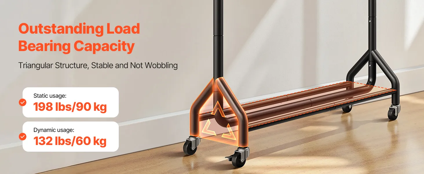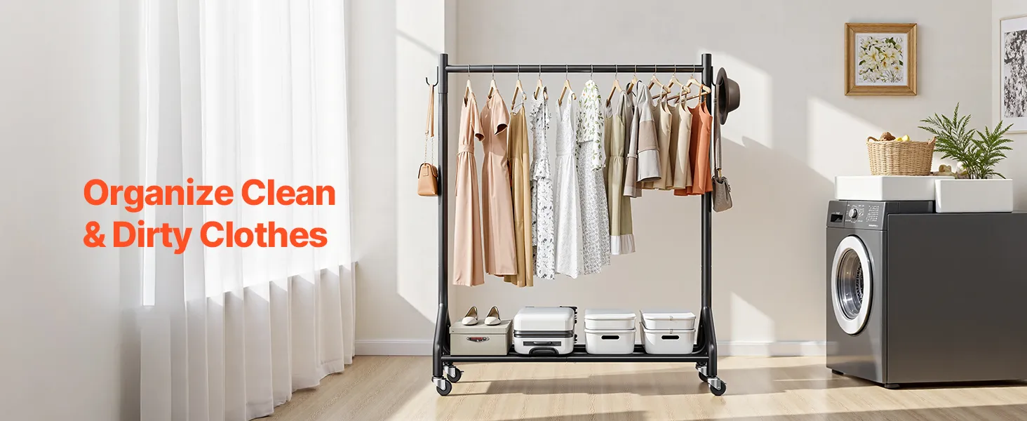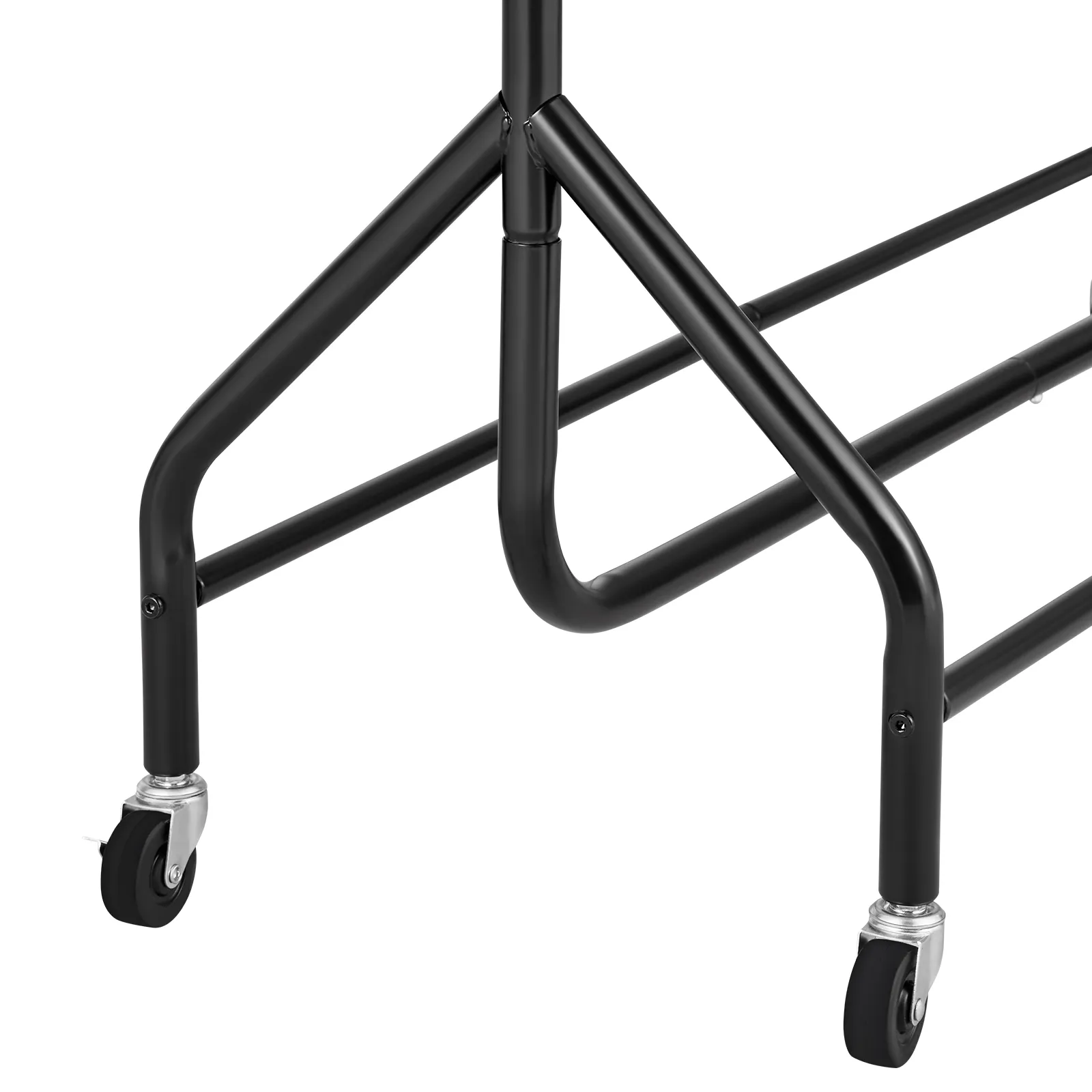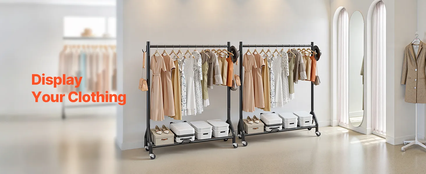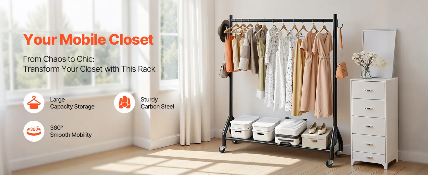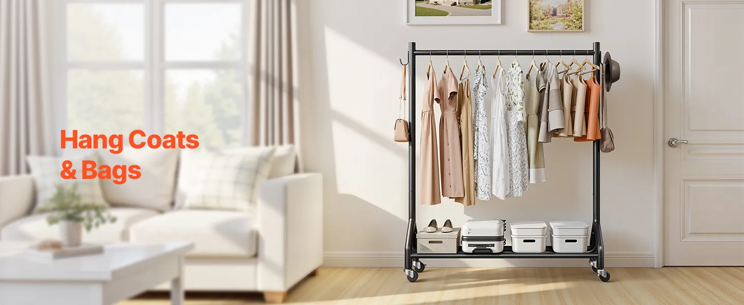 Tento stojan na oblečenie poskytuje dostatok úložného priestoru pre oblečenie všetkých veľkostí. Je vyrobený z odolnej uhlíkovej ocele, ktorá zaručuje stabilitu, a jeho 360° otočné kolieska uľahčujú premiestňovanie a organizáciu odevov.