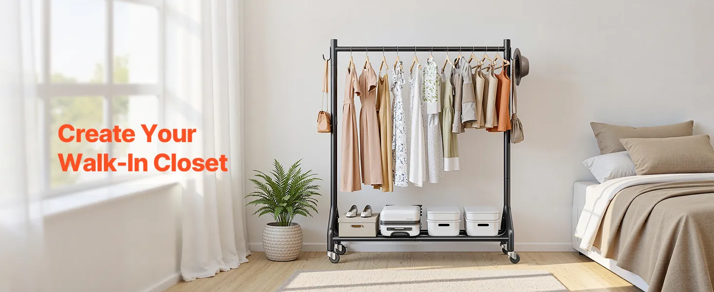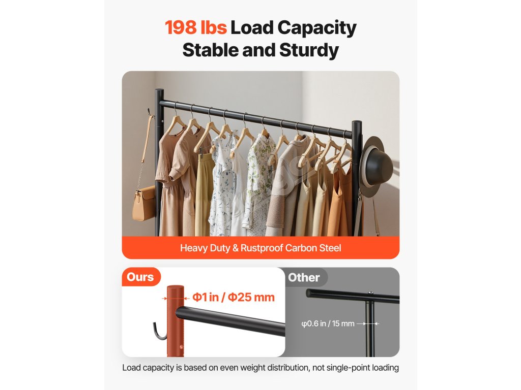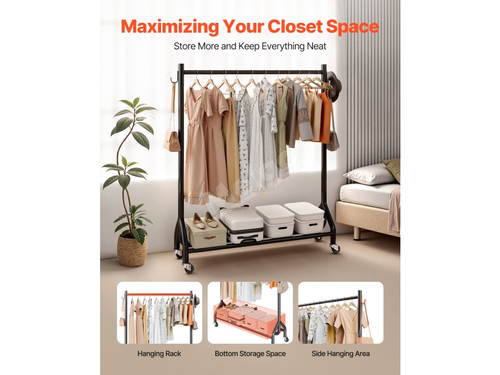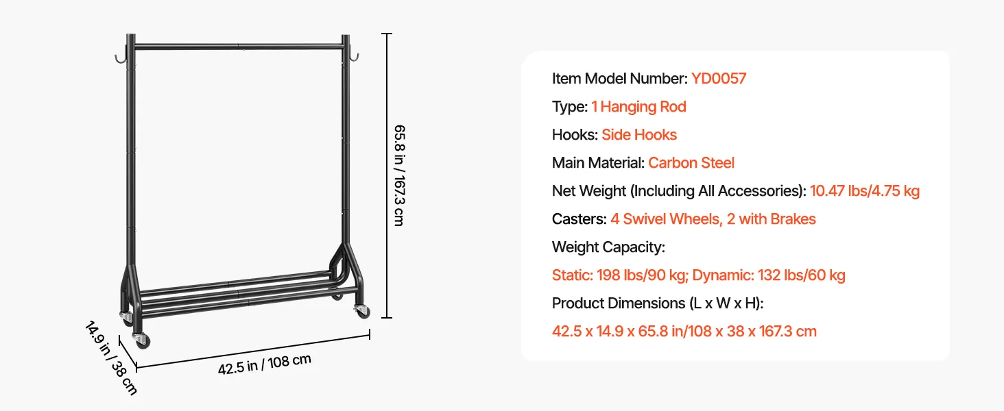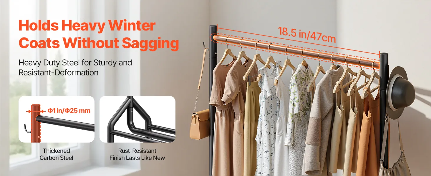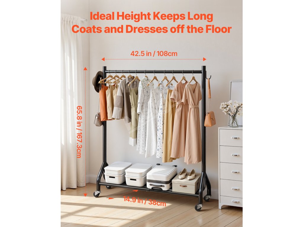 Tento stojan na oblečenie poskytuje dostatok úložného priestoru pre oblečenie všetkých veľkostí. Je vyrobený z odolnej uhlíkovej ocele, ktorá zaručuje stabilitu, a jeho 360° otočné kolieska uľahčujú premiestňovanie a organizáciu odevov.